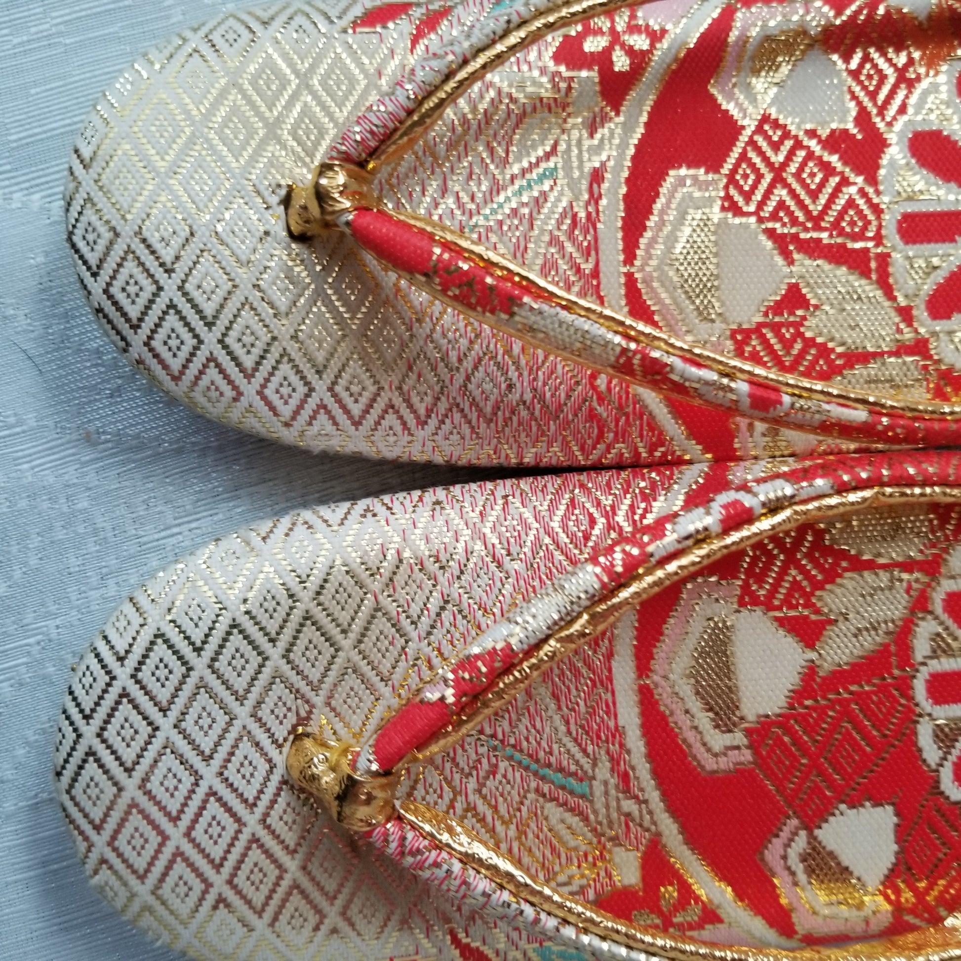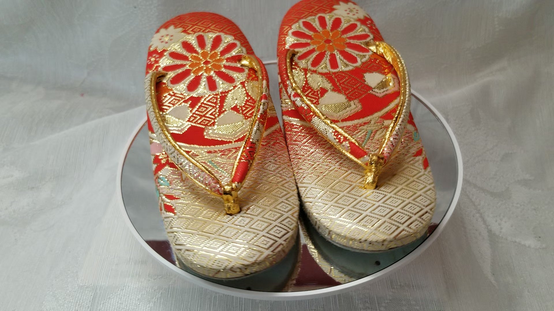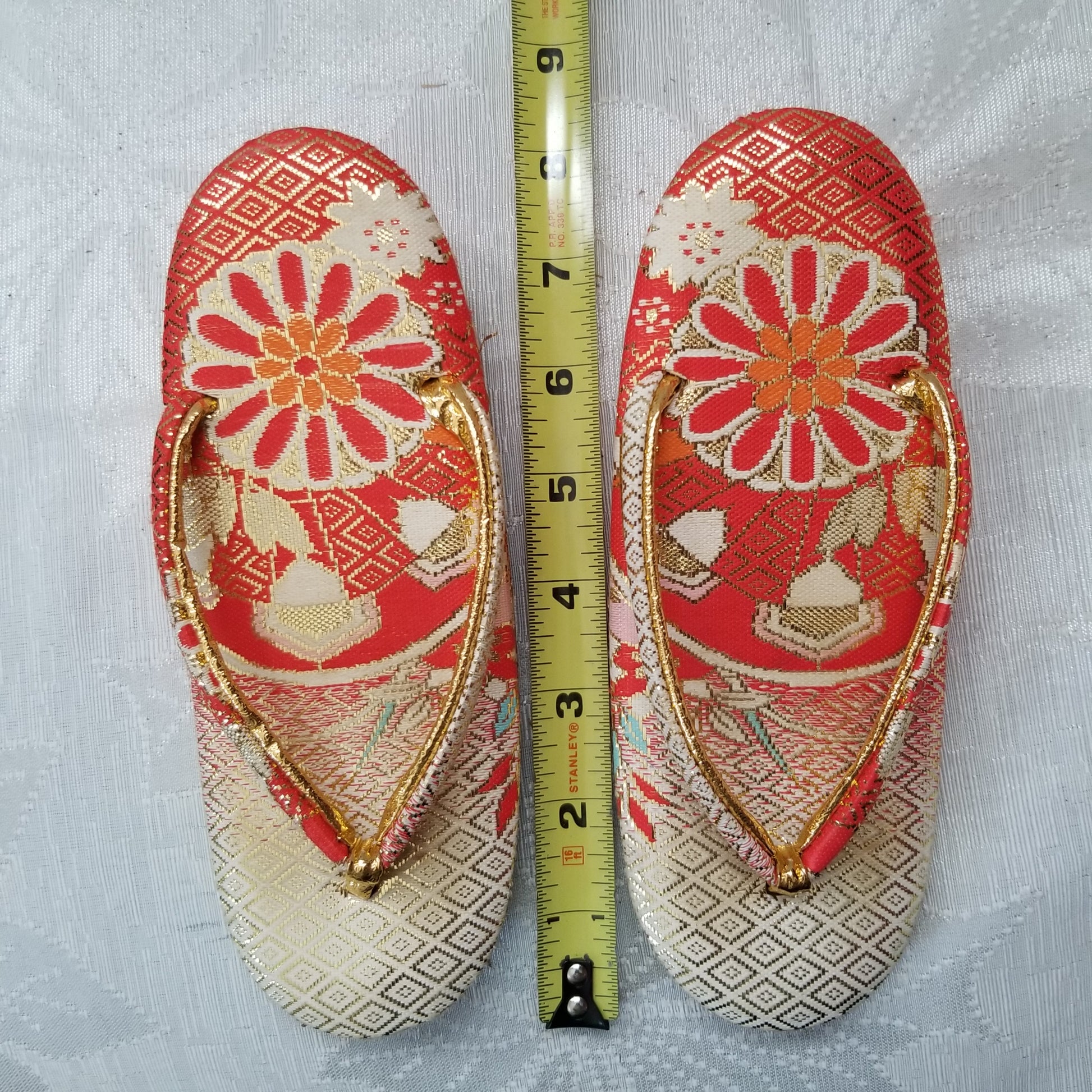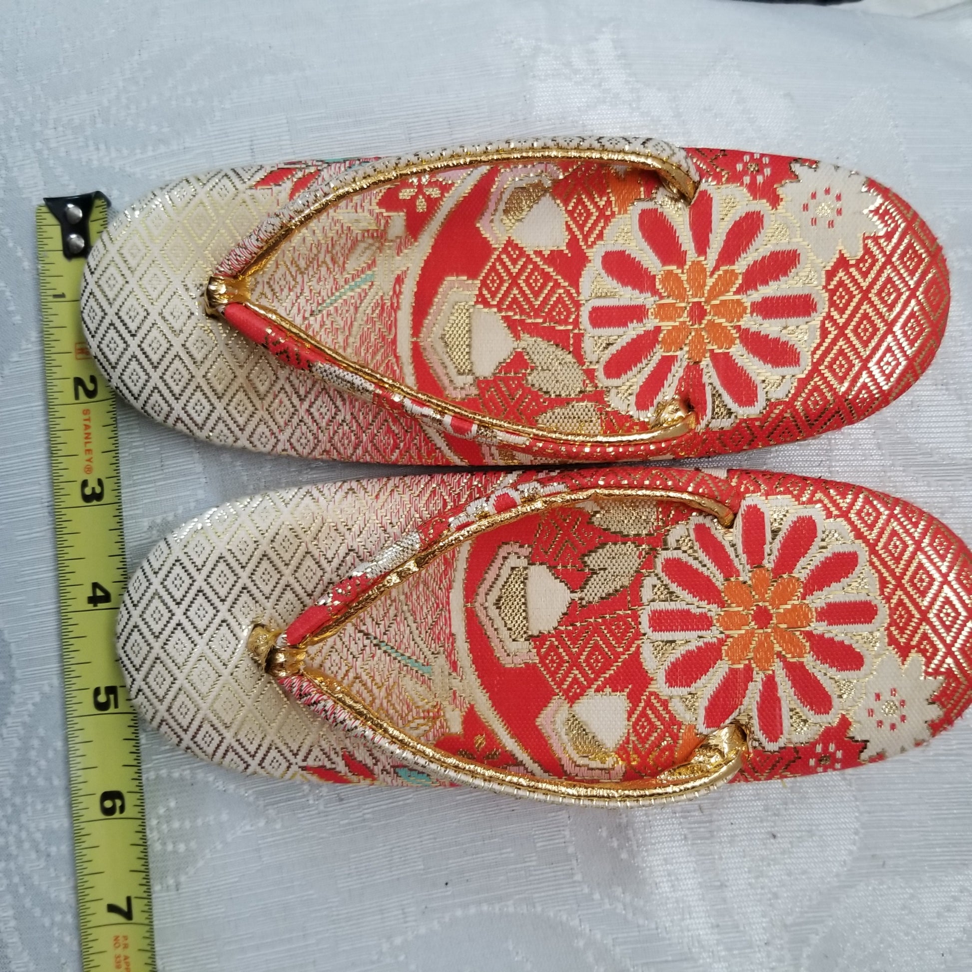 This listing is for a pair of zori - the traditional wedge shoes that are typically worn with a formal or semi-formal kimono. These are for a little girl - perhaps to wear to the Shichi-Go-San Festival.