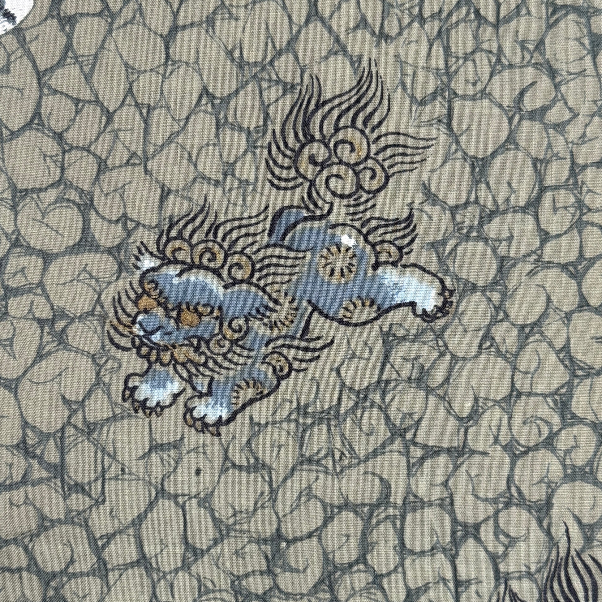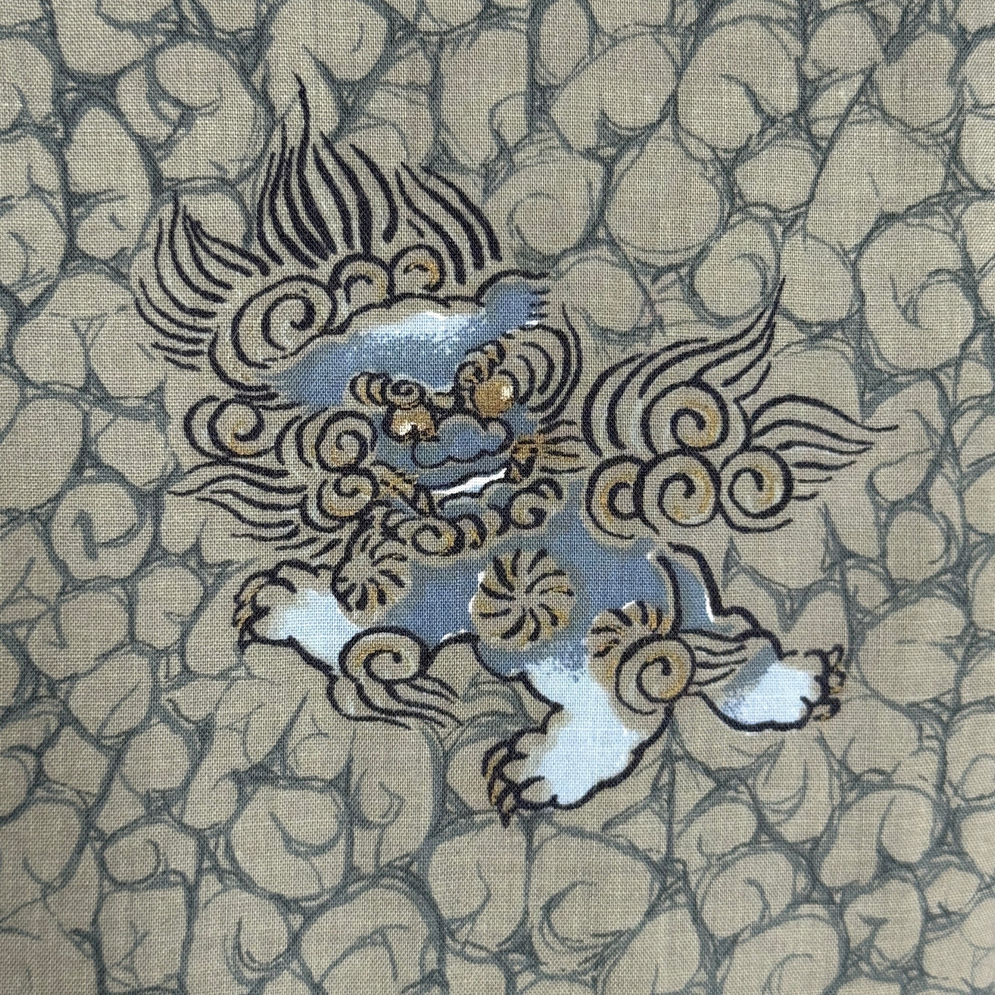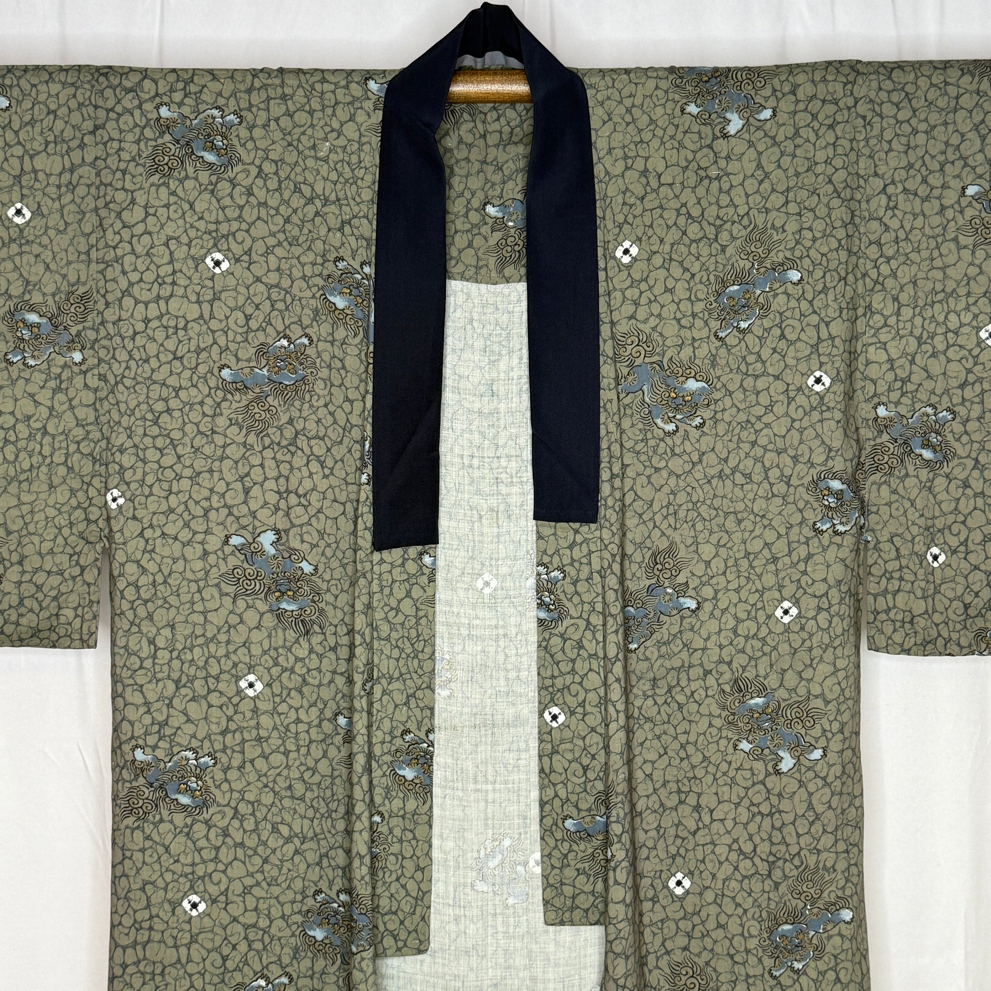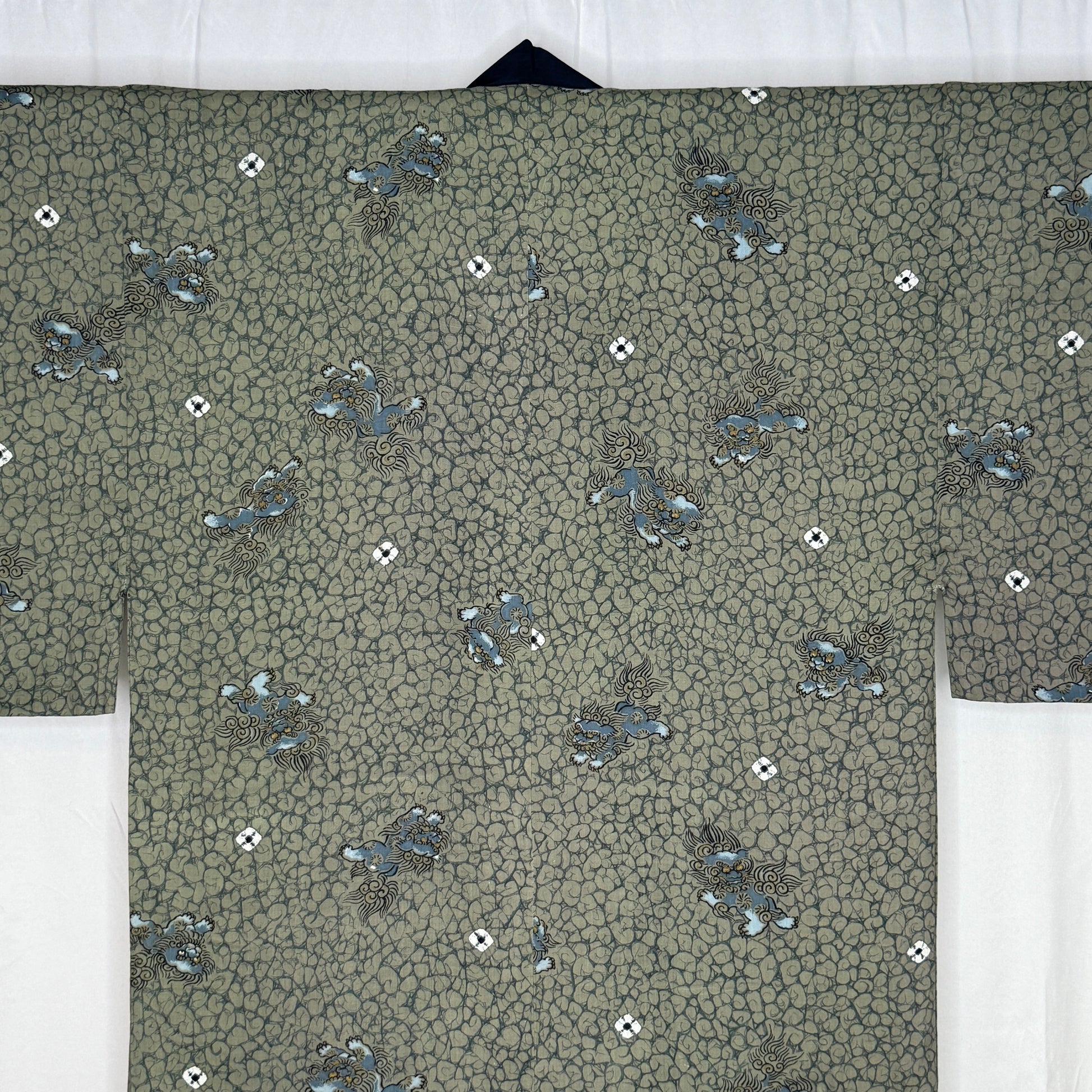 This juban features karajishi or fu dogs which are protective mythical lions in Buddhism. Several of these lions - each with a curling mane and tail - float atop what could be a layer of tiny stones. Scattered, rounded diamonds in white and black are stenciled to mimic the shibori technique.