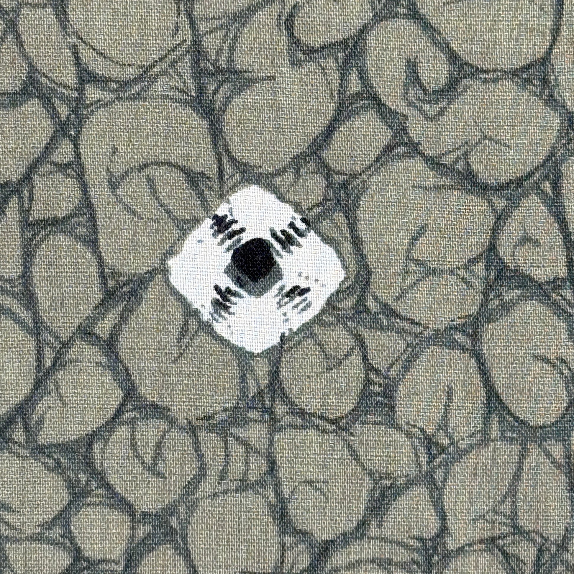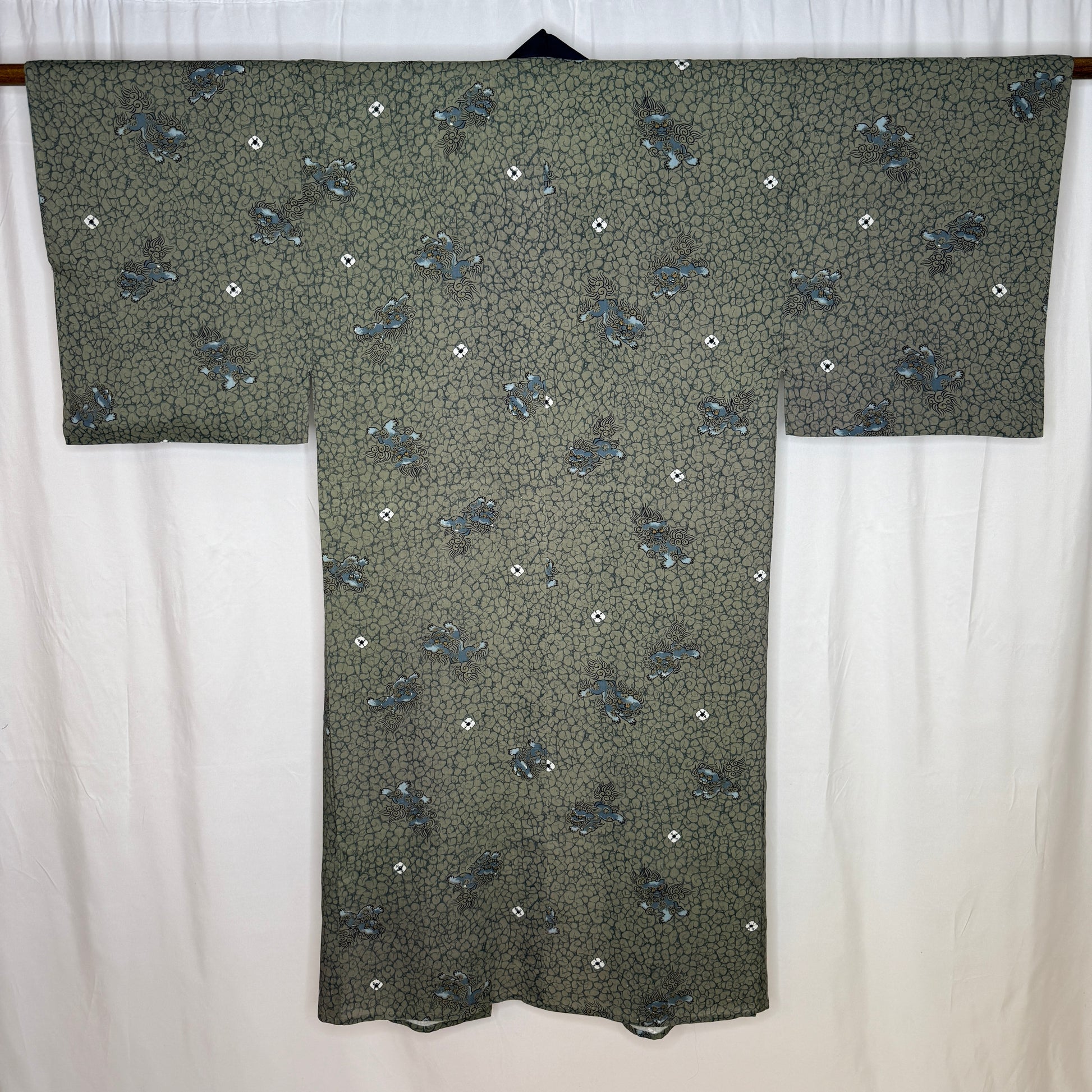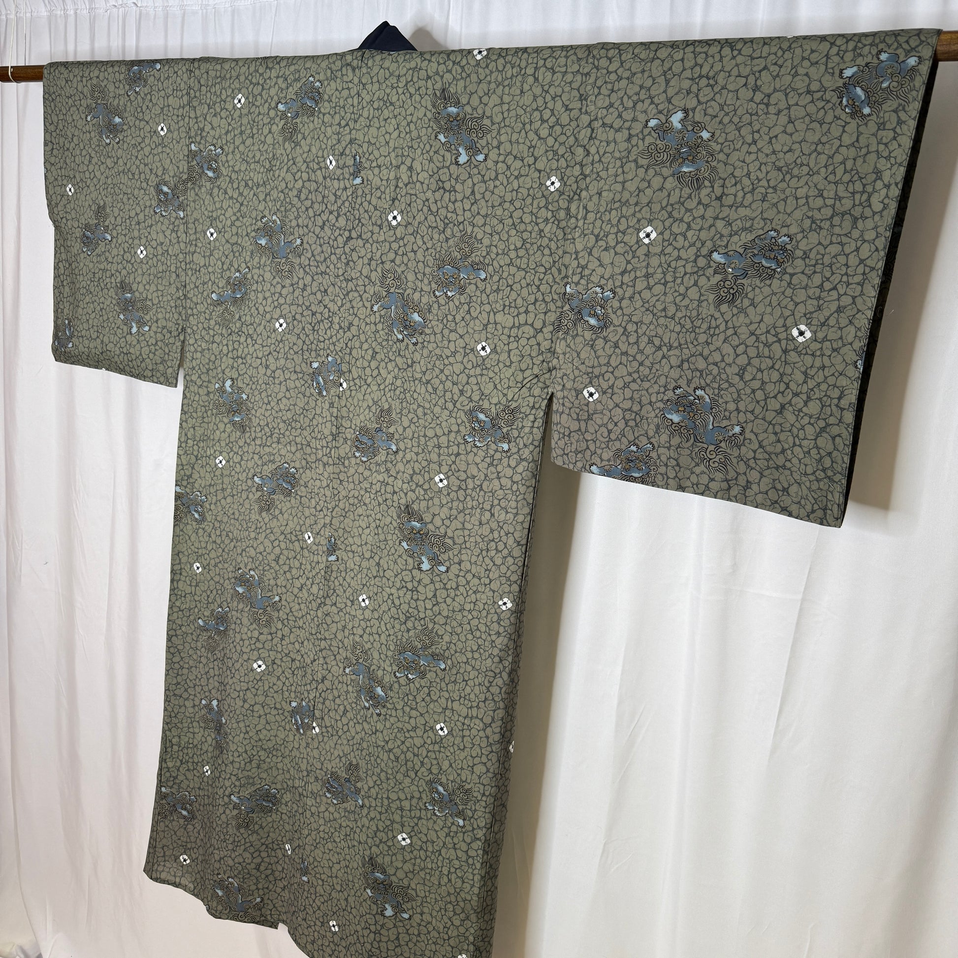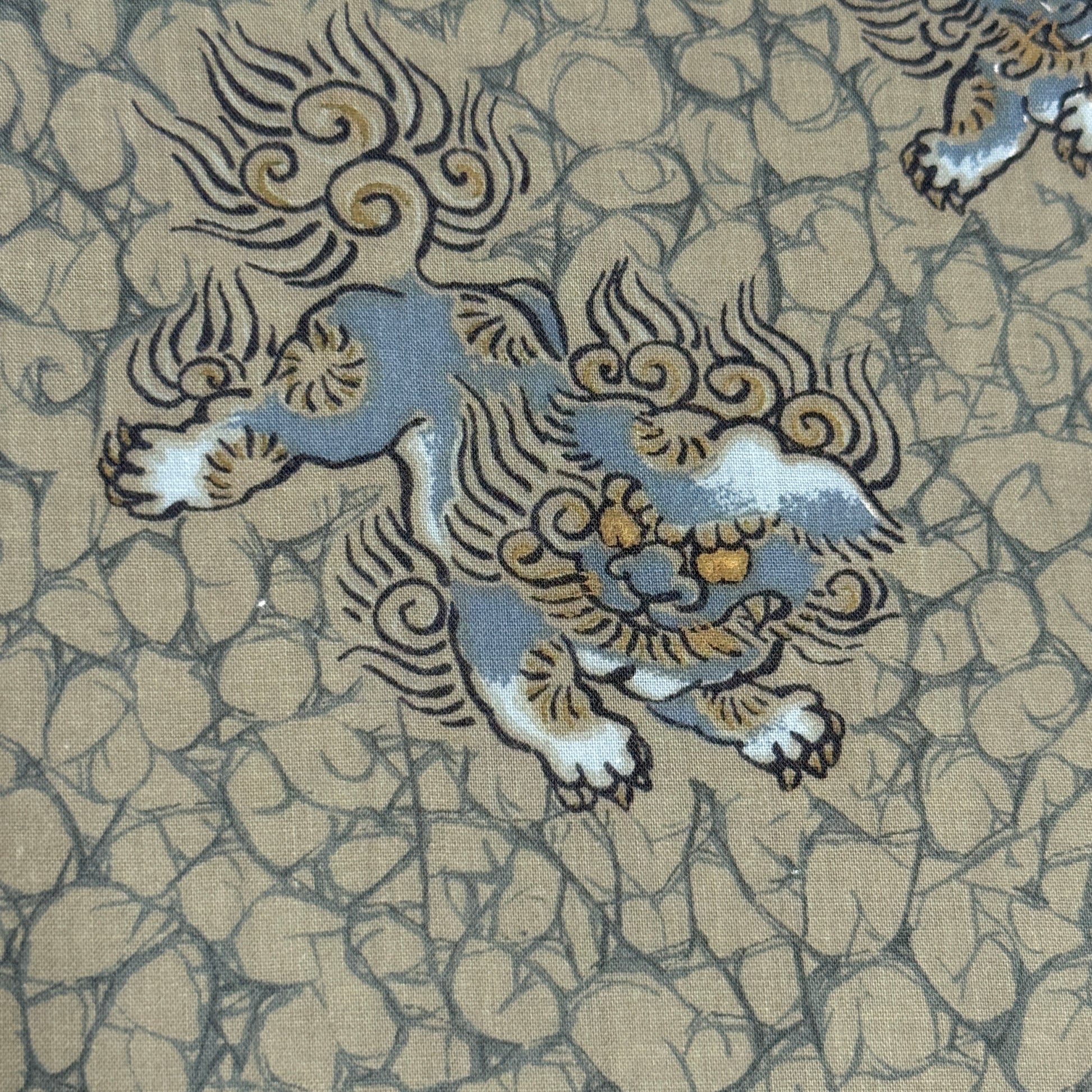 This juban features karajishi or fu dogs which are protective mythical lions in Buddhism. Several of these lions - each with a curling mane and tail - float atop what could be a layer of tiny stones. Scattered, rounded diamonds in white and black are stenciled to mimic the shibori technique.