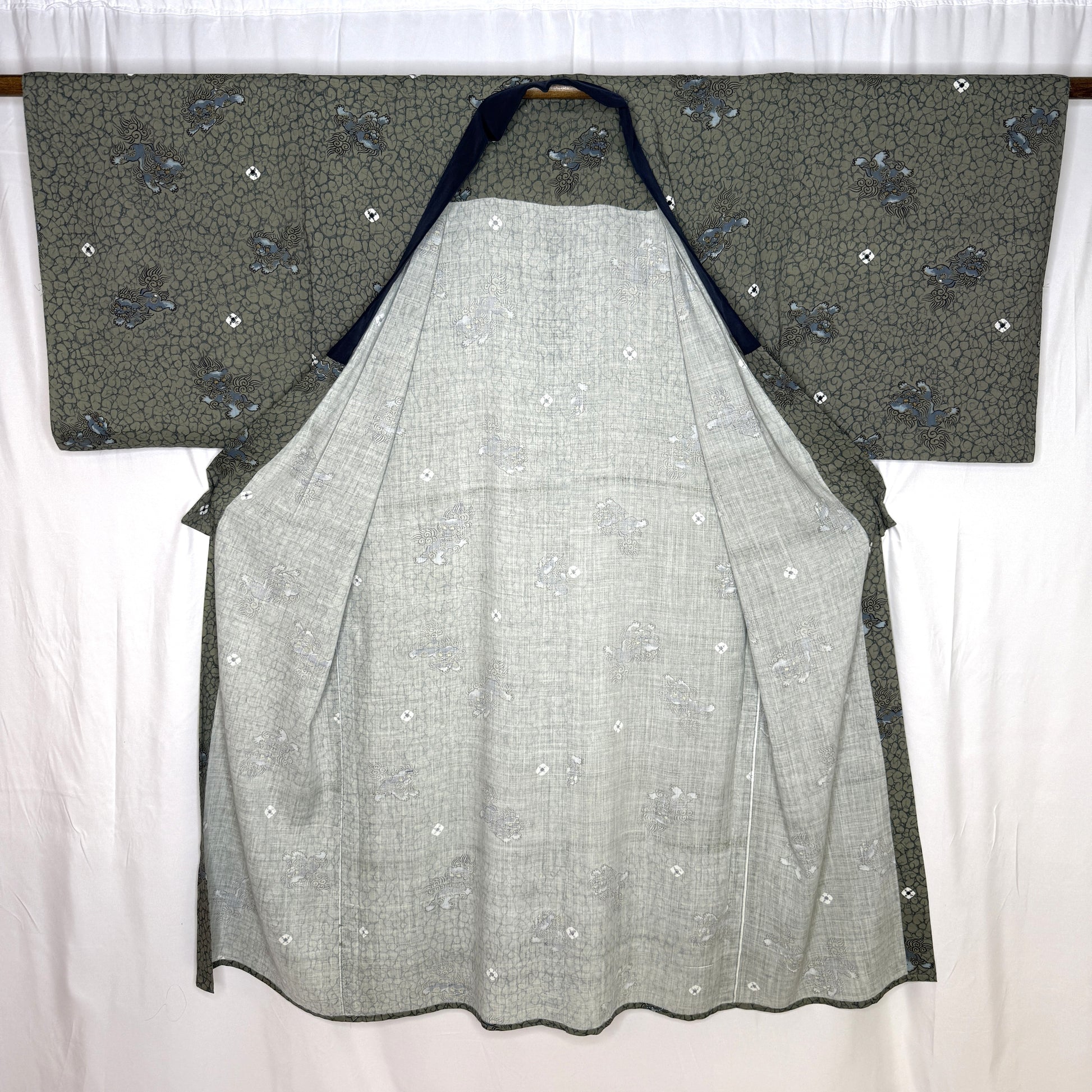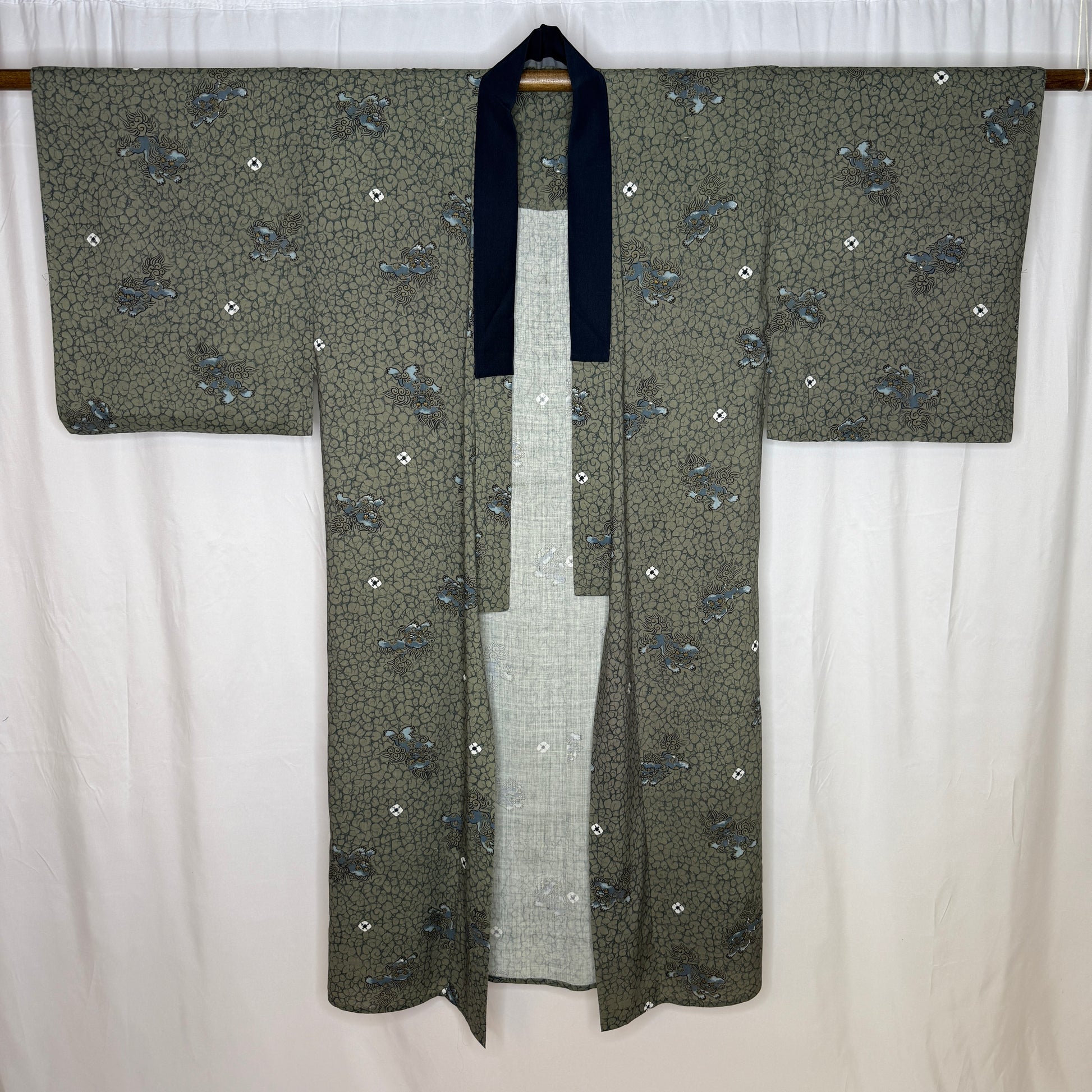 This listing is for an underkimono - called a "juban" in Japanese - which would be worn under a man's kimono. Juban often feature designs that reflect the interests of their owner but are rarely seen in public since they are layered underneath a kimono. Just in inch or two of the over-collar is visible, though you may catch a glimpse of the sleeve edge at the wrist. Juban make great casual robes.
