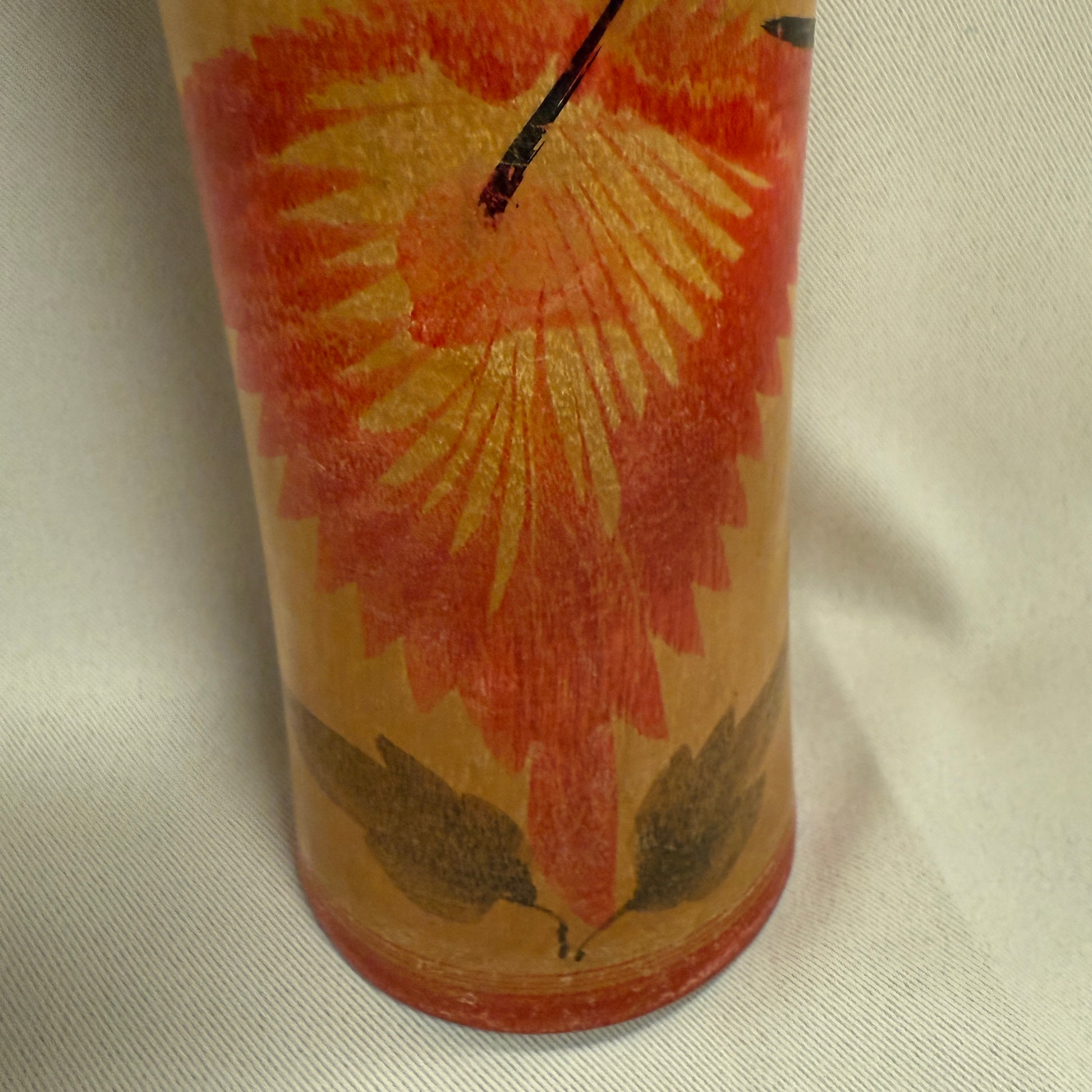 This is a traditional style kokeshi doll featuring the classic Narugo style in Miyagi Prefecture. The body features a large floral (chrysanthemum) design with a bold kanji that translates to "hana" or "flower". The facial features are minimal - brushstroke hair in black and a small smile. On the bottom is the artist's signature - Kumoi Ichizo who is a known traditional kokeshi artisan.