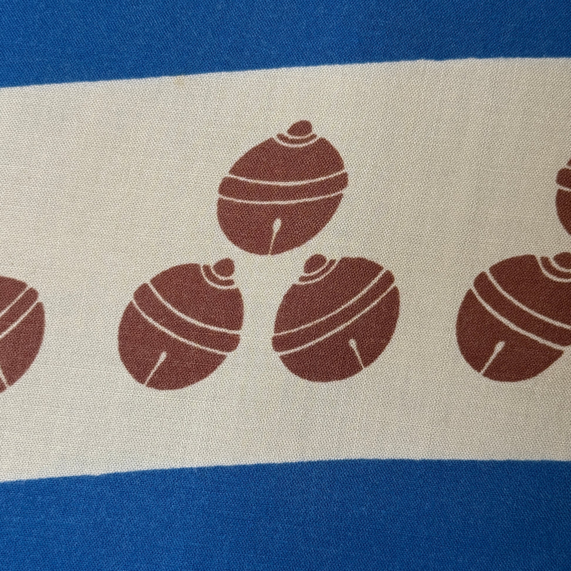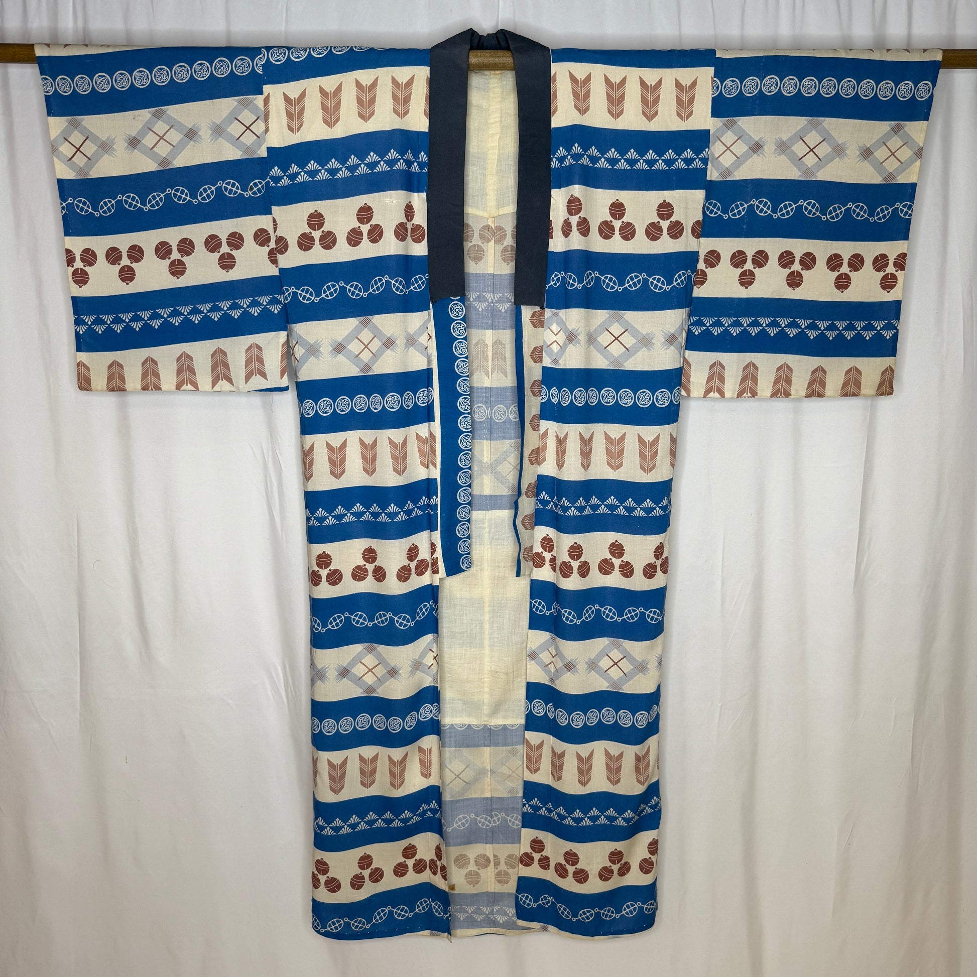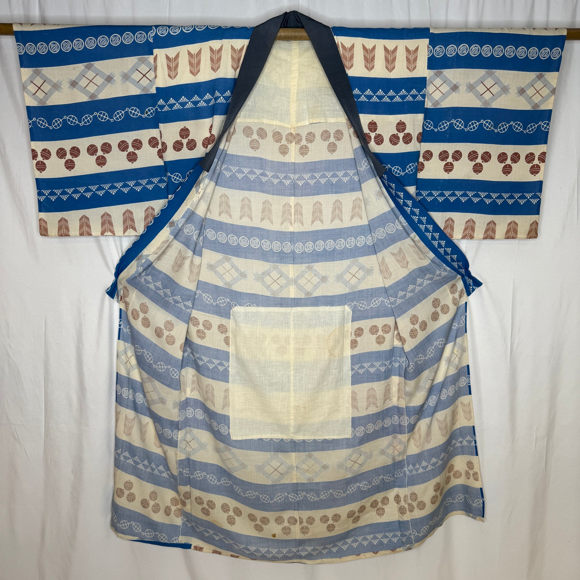 This vintage men's underkimono hums with rhythmic charm, featuring sky blue and cream stripes adorned with lucky bells and arrow feathers. The bells, symbols of good fortune and festivity, alternate with stylized ya-no-hane (arrow fletching) that represent courage and direction. The design captures the energy of motion and sound of festival music woven into cloth. Lightweight cotton with no lining.