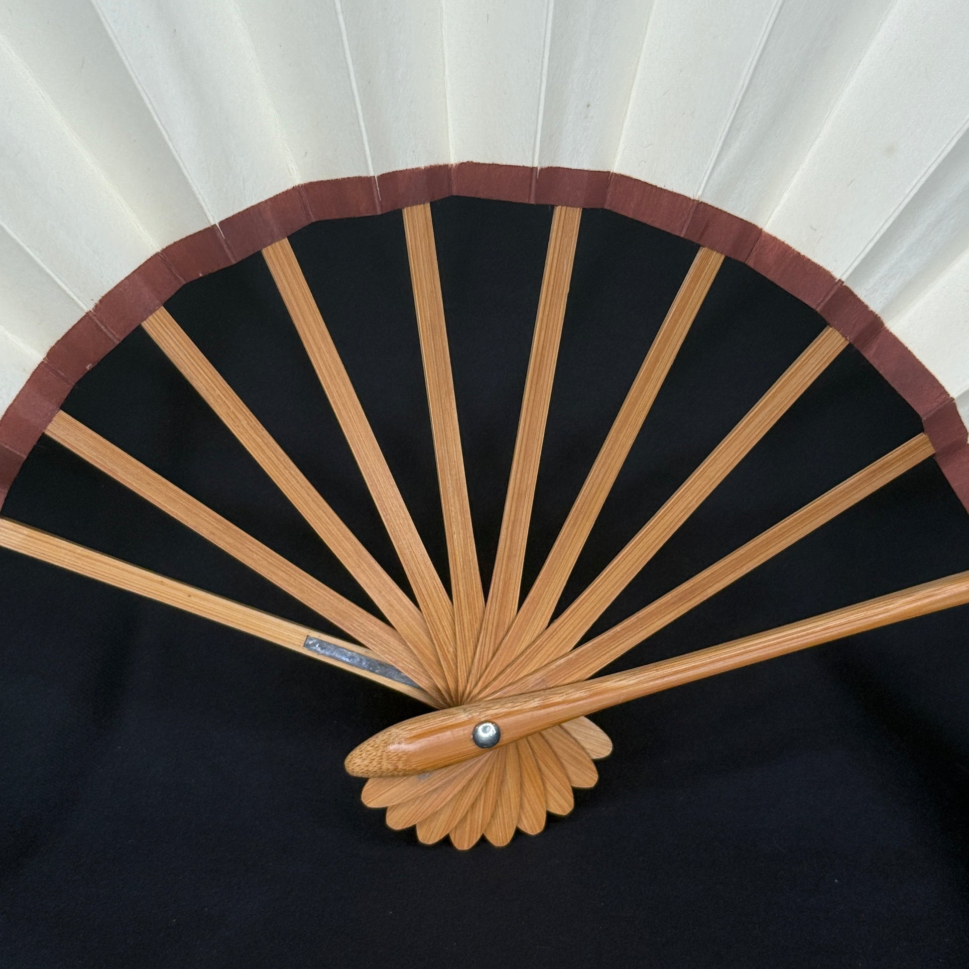 This elegant Japanese dance fan features a minimalist design in warm cream paper edged in a dark red. The simplicity of its form evokes the refined restraint of Kyoto stage traditions, where gesture and color convey emotion more powerfully than embellishment.