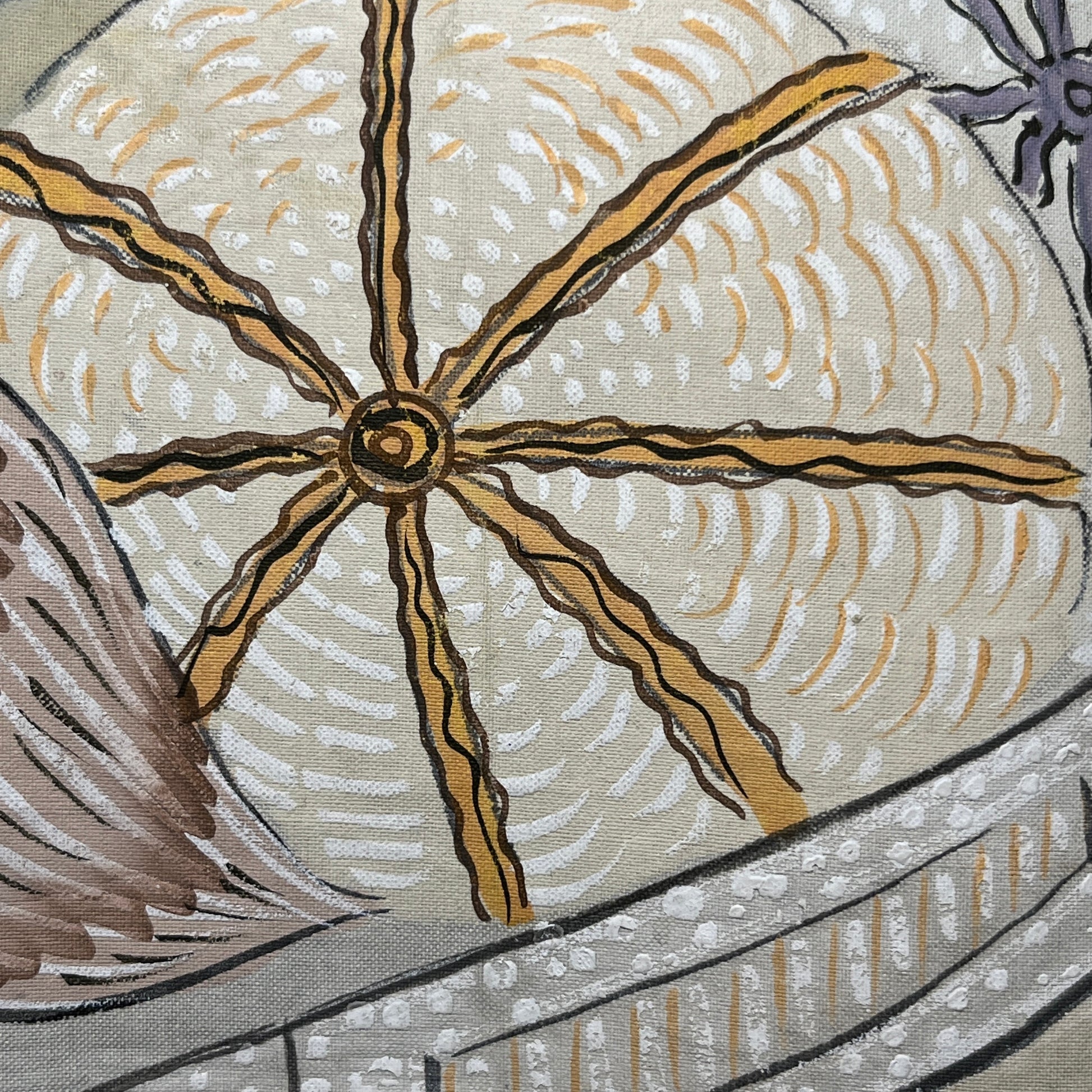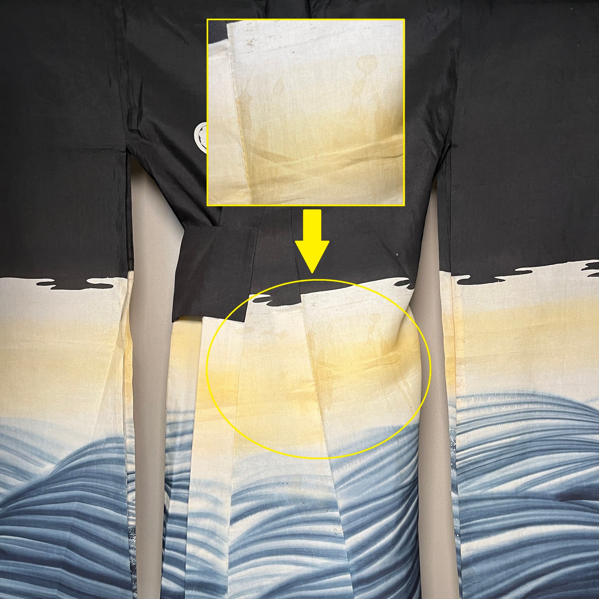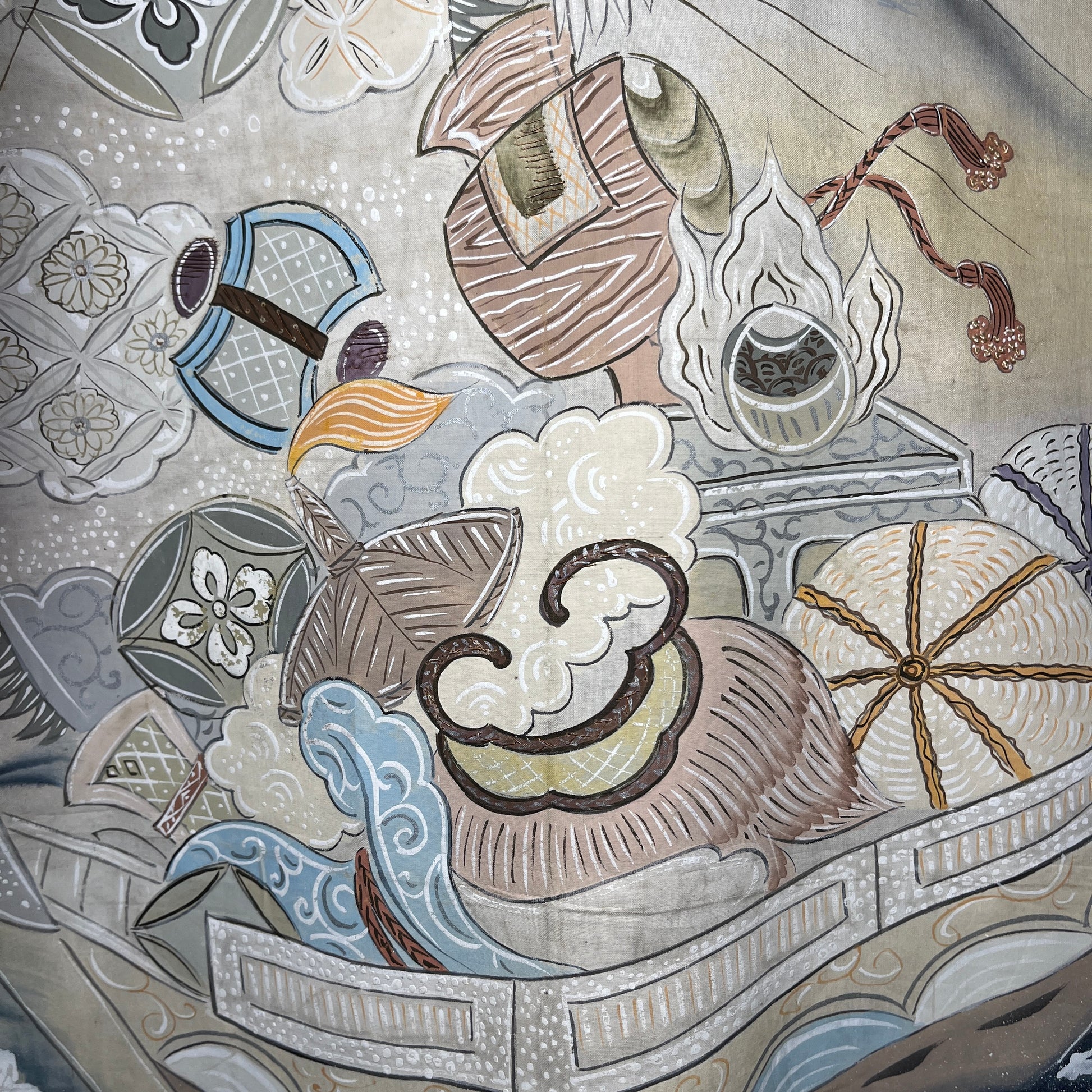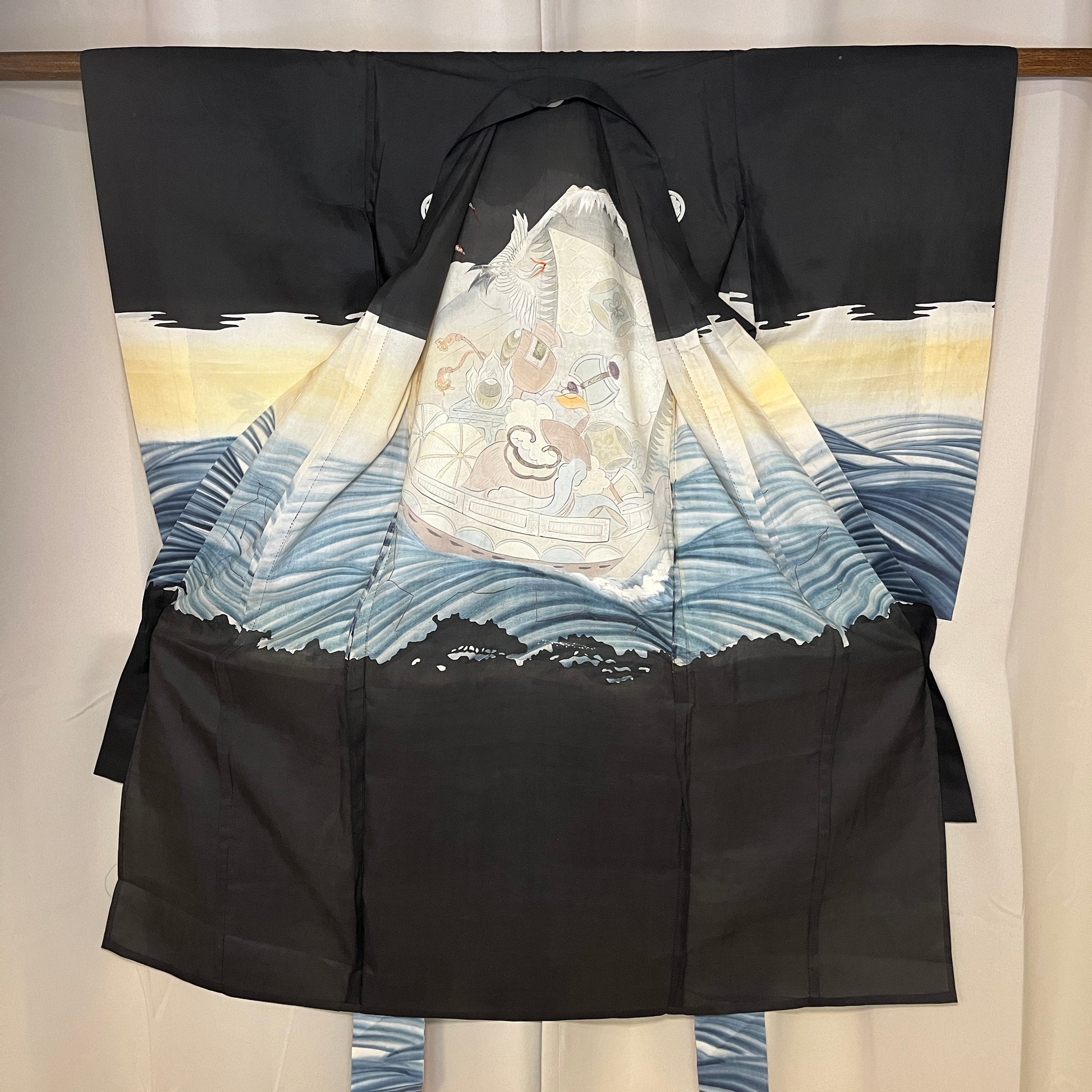 This kimono features a very lightly colored takaruabune - the ship filled with treasures from mythology that sails from the heavens at New Year's bringing gifts of prosperity. Those gifts include a kakuragasa (a hat of invisibility), orimono (a bolt of brocade fabric), kanebukuro (a bottomless money pouch), kagi (the keys to a treasure house), makimono (scrolls of wisdom), kozuchi (magic mallet that grants wishes), kakuremino (lucky raincoat), hagoromo (robe of fairy feathers) and nunobukuro (bottomless bag of treasures). The ethereal coloring of the central image adds more of the "other world" effect to the design, in contrast to the more vibrantly colored versions that are more commonly seen.