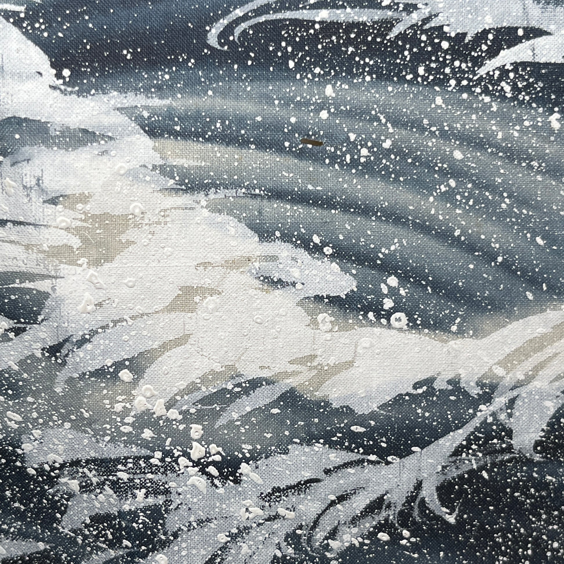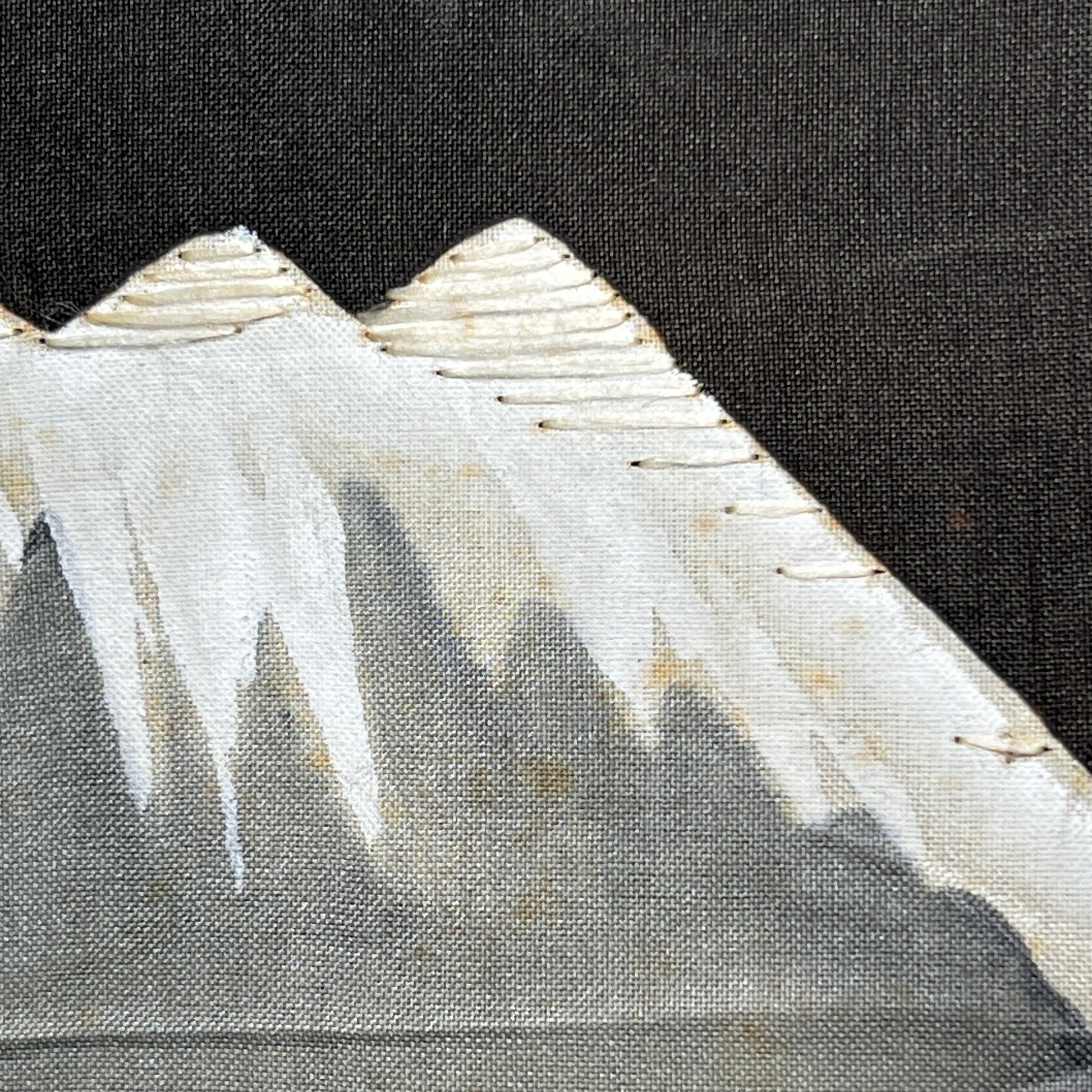 Three white cranes float above the ship, guiding the voyage. Some elements are outlined in gold couching. Mt. Fuji in the distance. Unlined. Some light blemishes on the front, see last photo.