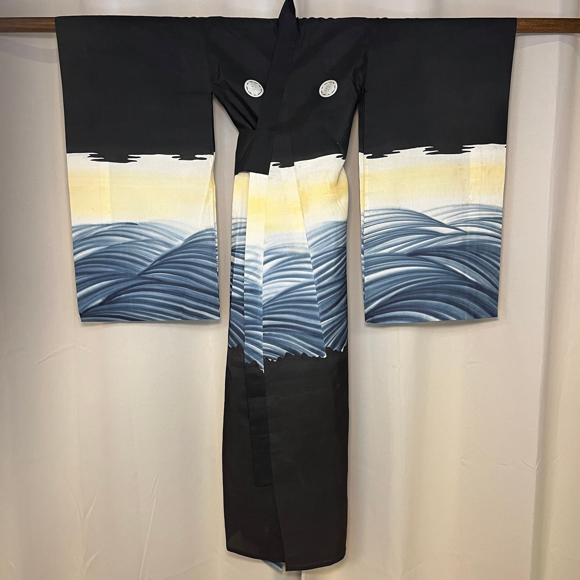 This is a vintage Japanese boy's formal kimono, called a miyamairi. These ceremonial kimono typically have dark bands at the top and hem, with a dramatic design in the center, light-colored section, along with up to five family crests.