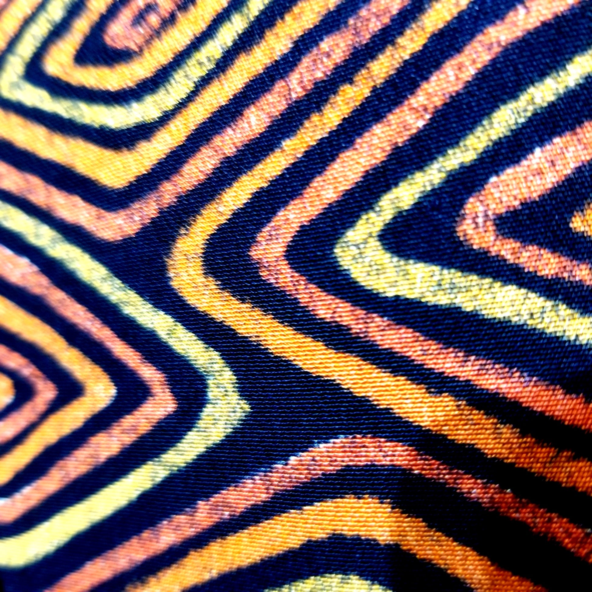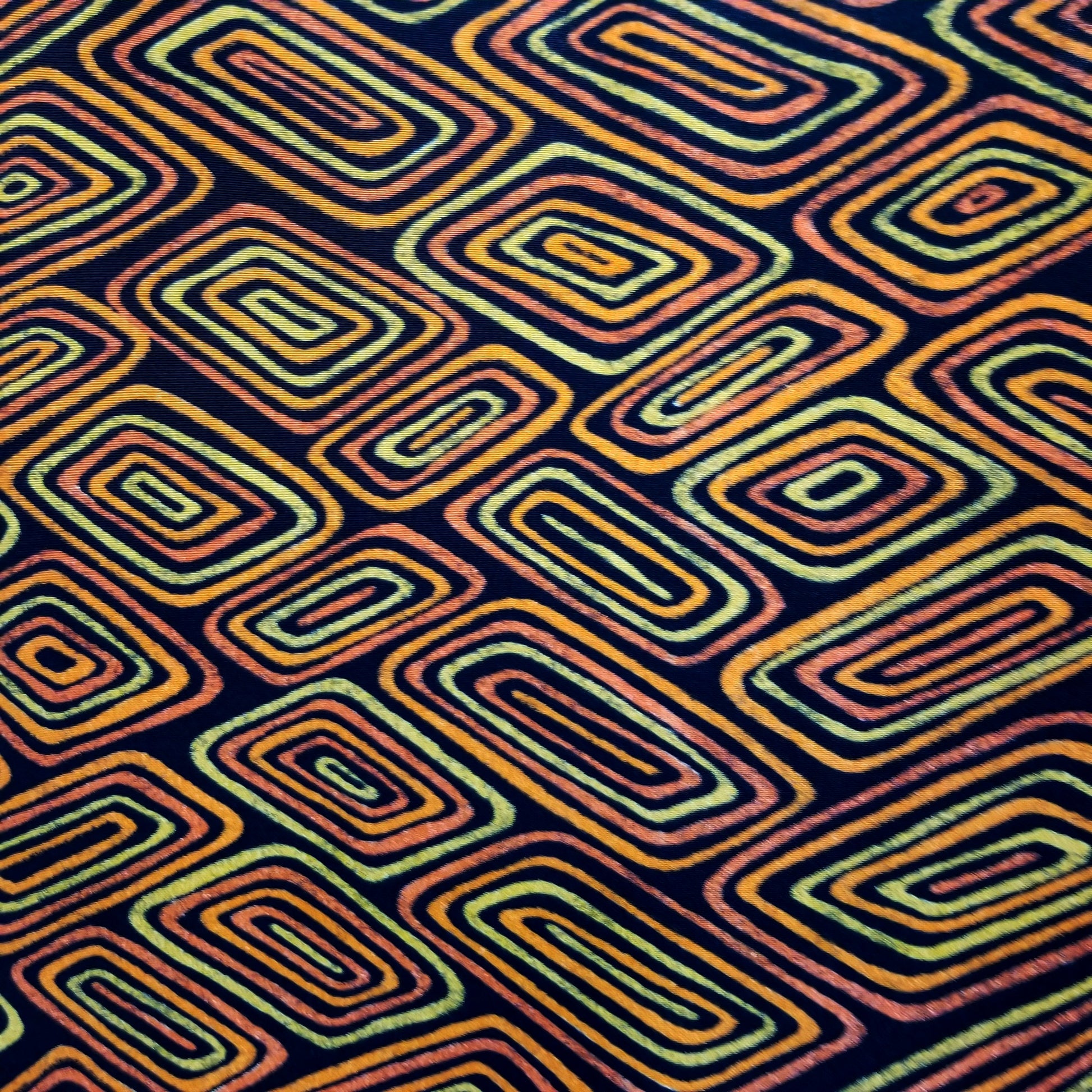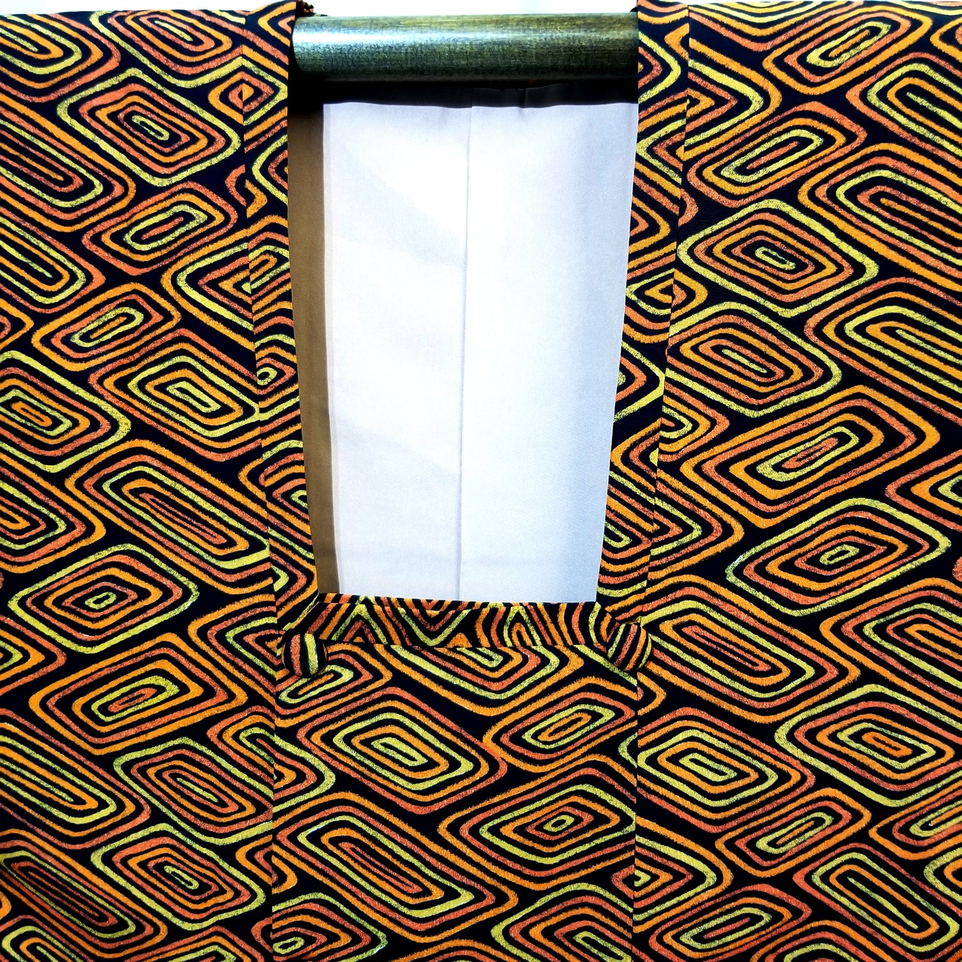 This jacket features a fun and funky retro pattern of nested rectangles in autum colors against a black background. We love the retro, bold graphics of this design! Great as a display piece in a mid-century modern decor!