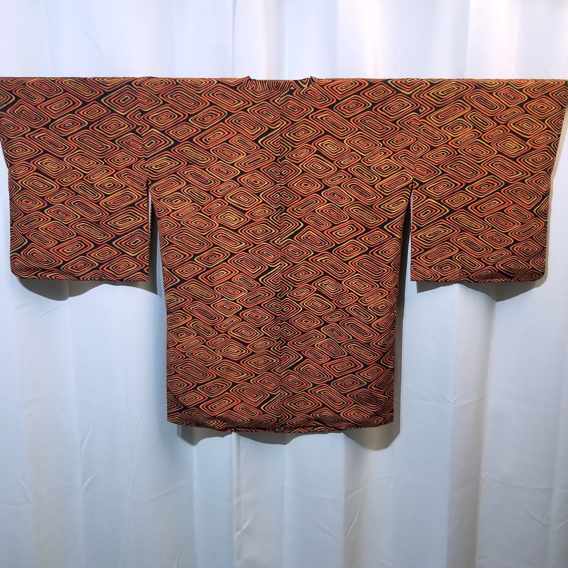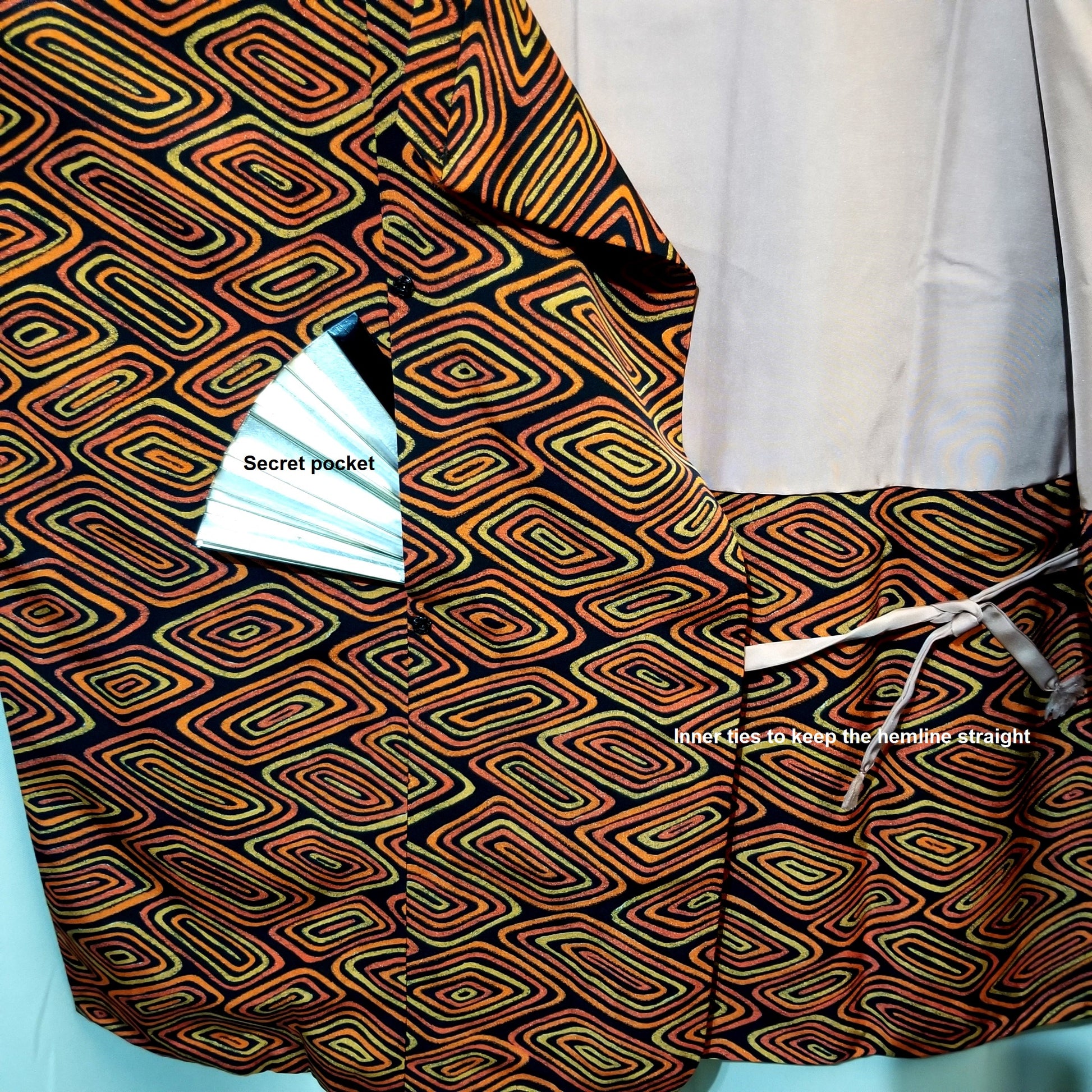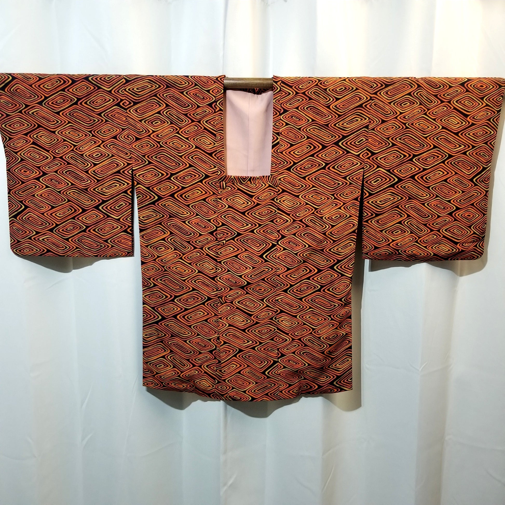 This listing is for a vintage michiyuki jacket, meant to be worn over a kimono. A square neck line, inner ties to keep the hemline straight, snap closure, and a hidden pocket on the right front panel are the specific features of a michiyuki - michi means "street" and yuki refers to "going out".