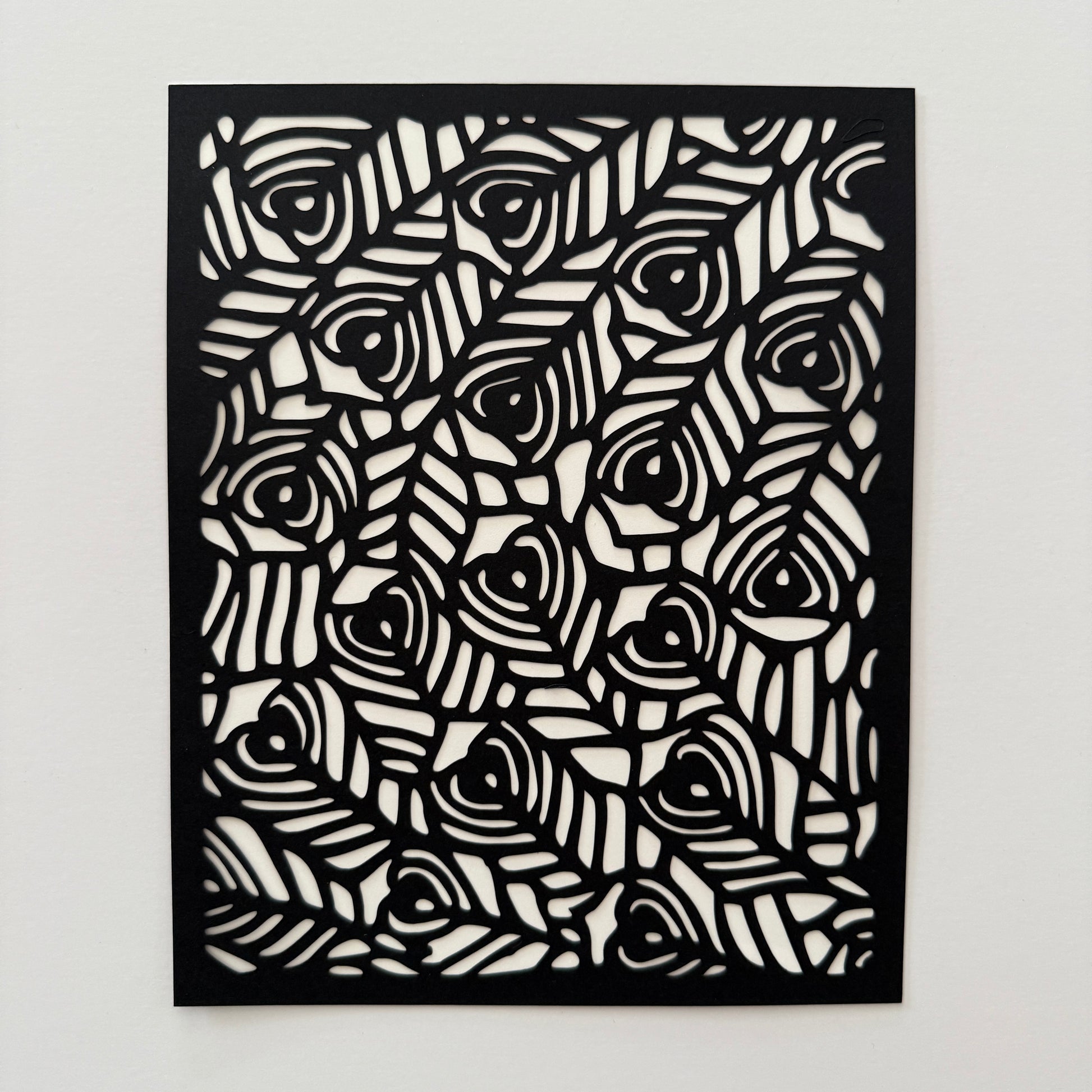 This image features a series of peacock feathers arranged like a mosaic or stained glass, with thick lines between each element.