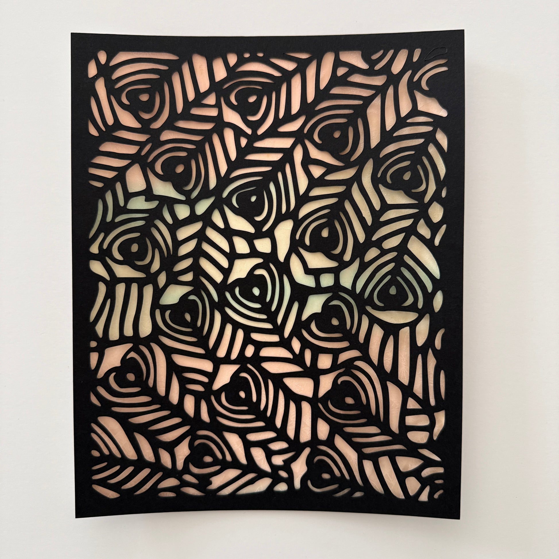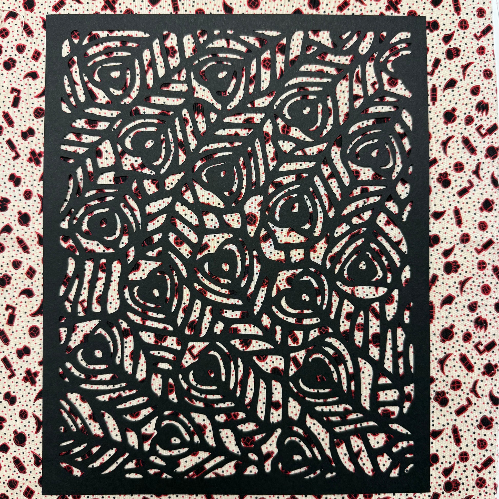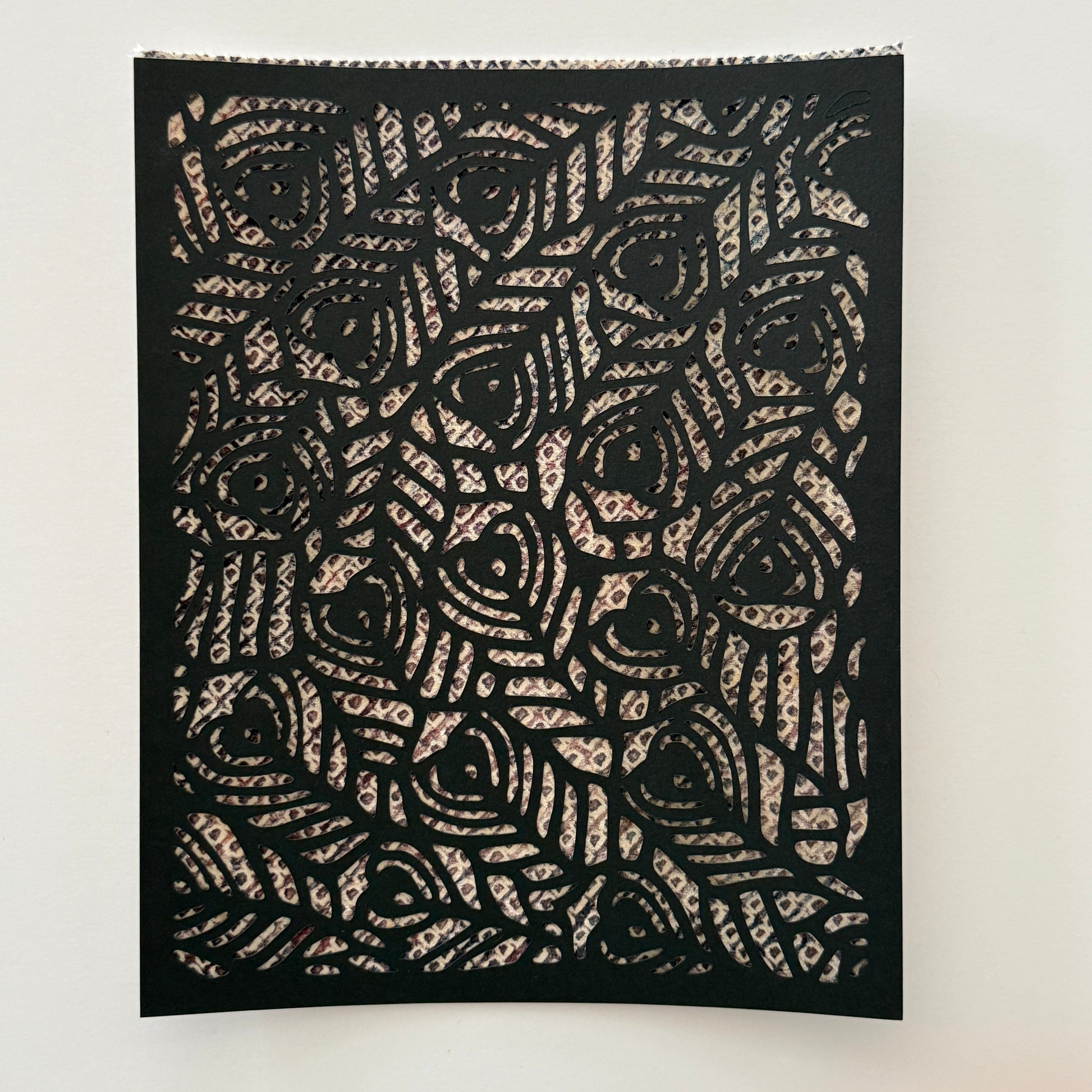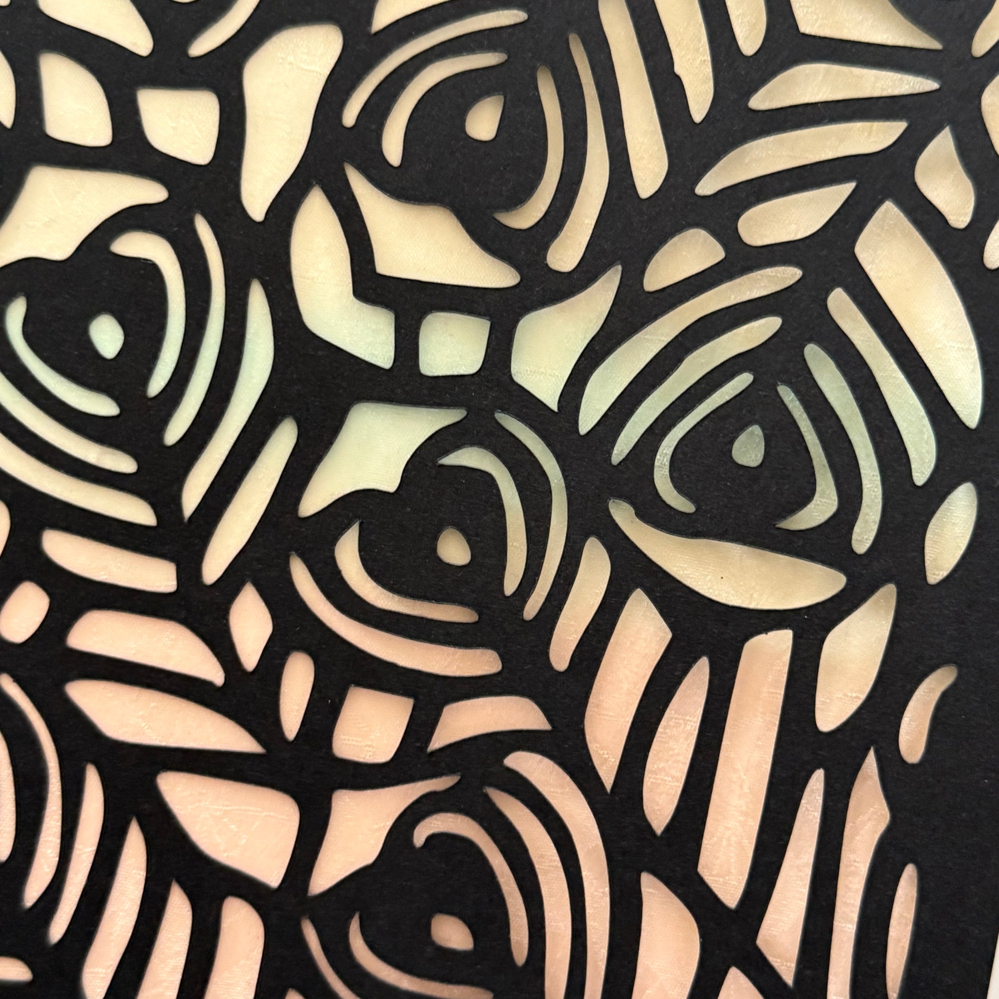 Your purchase includes only a sheet of the katagami art and a contrasting piece of cardstock to place behind it. Photos show examples of how placing different colored paper or fabric behind the stencil can change the display. The last photos give suggestions for framing.