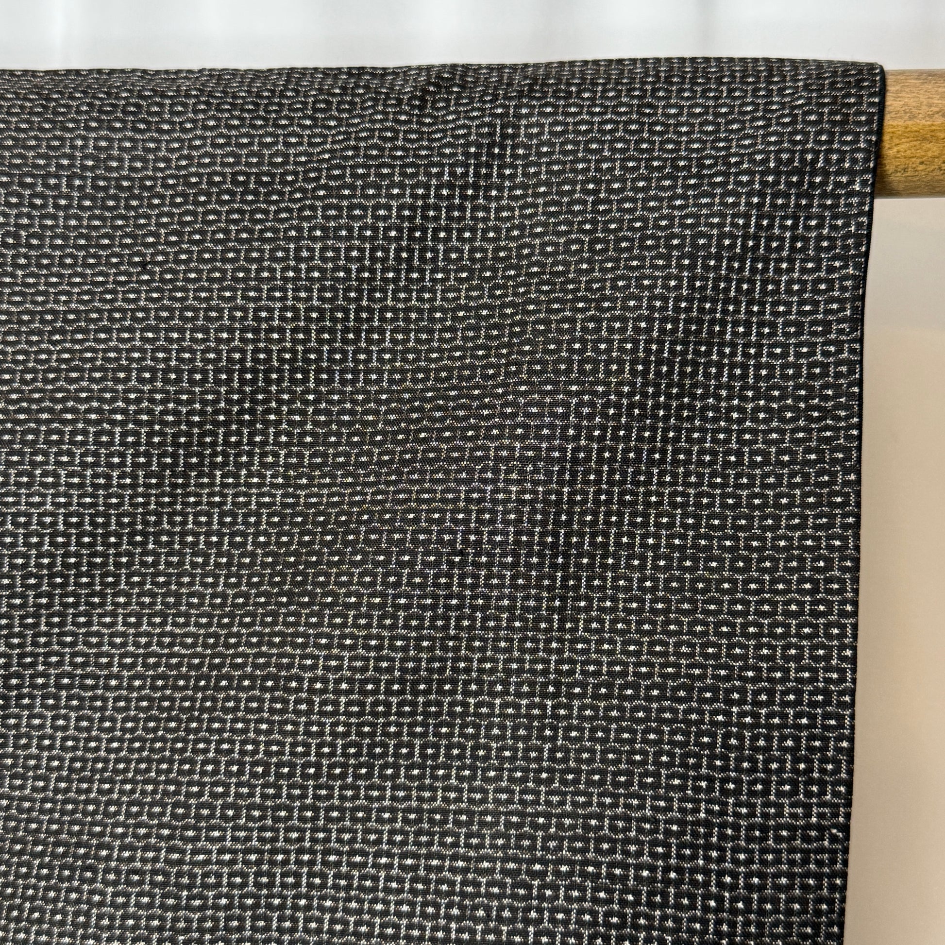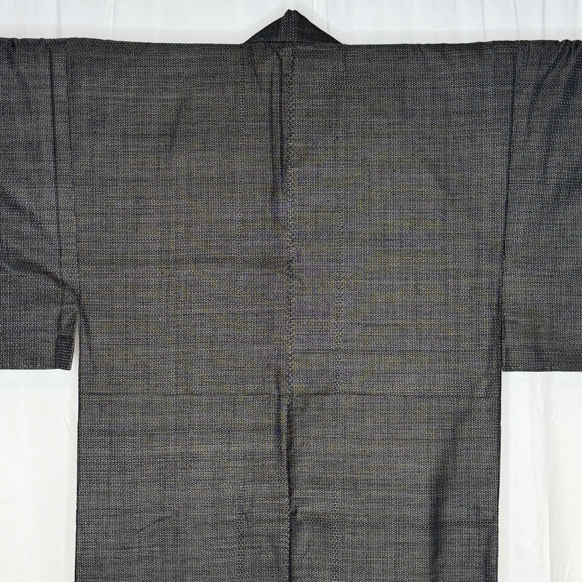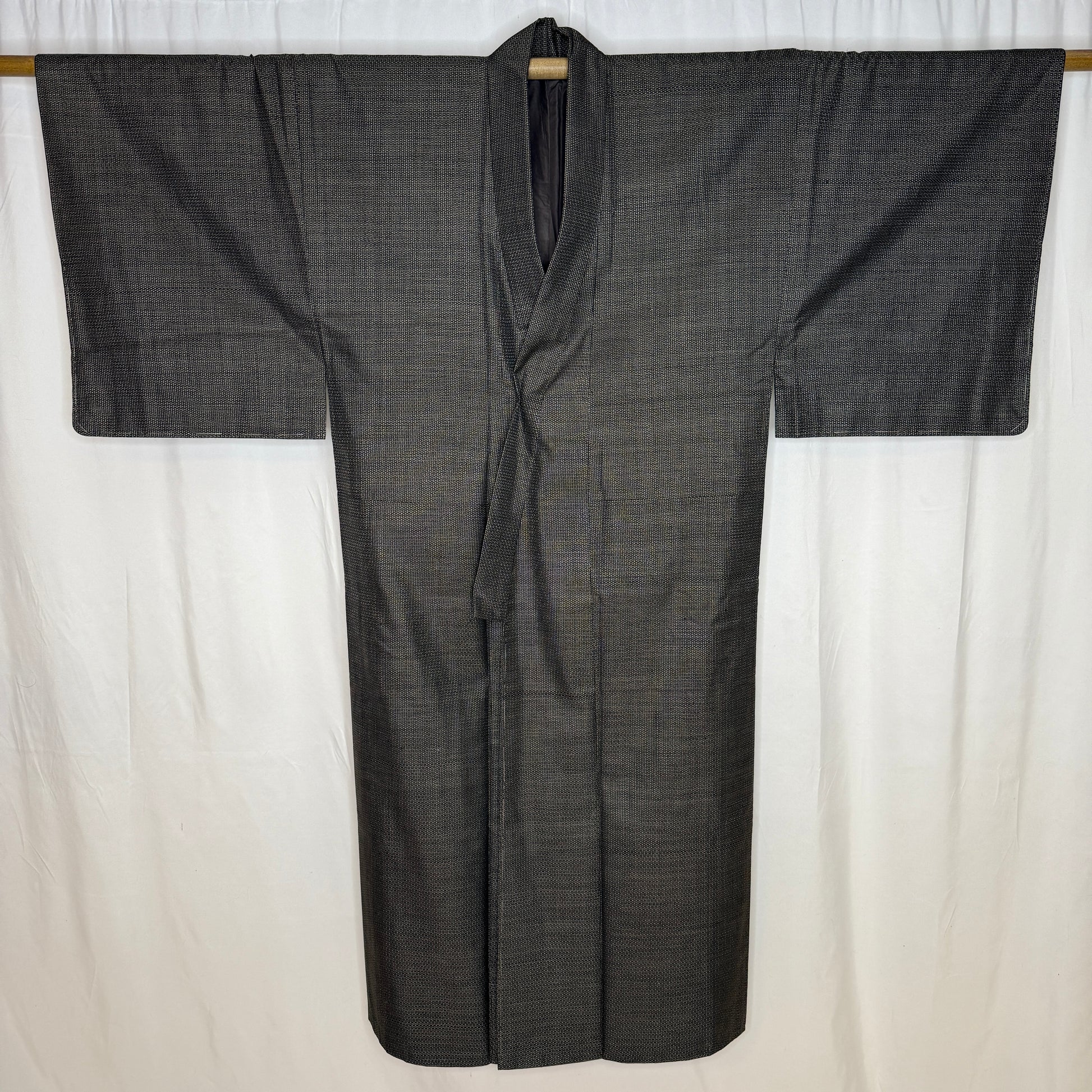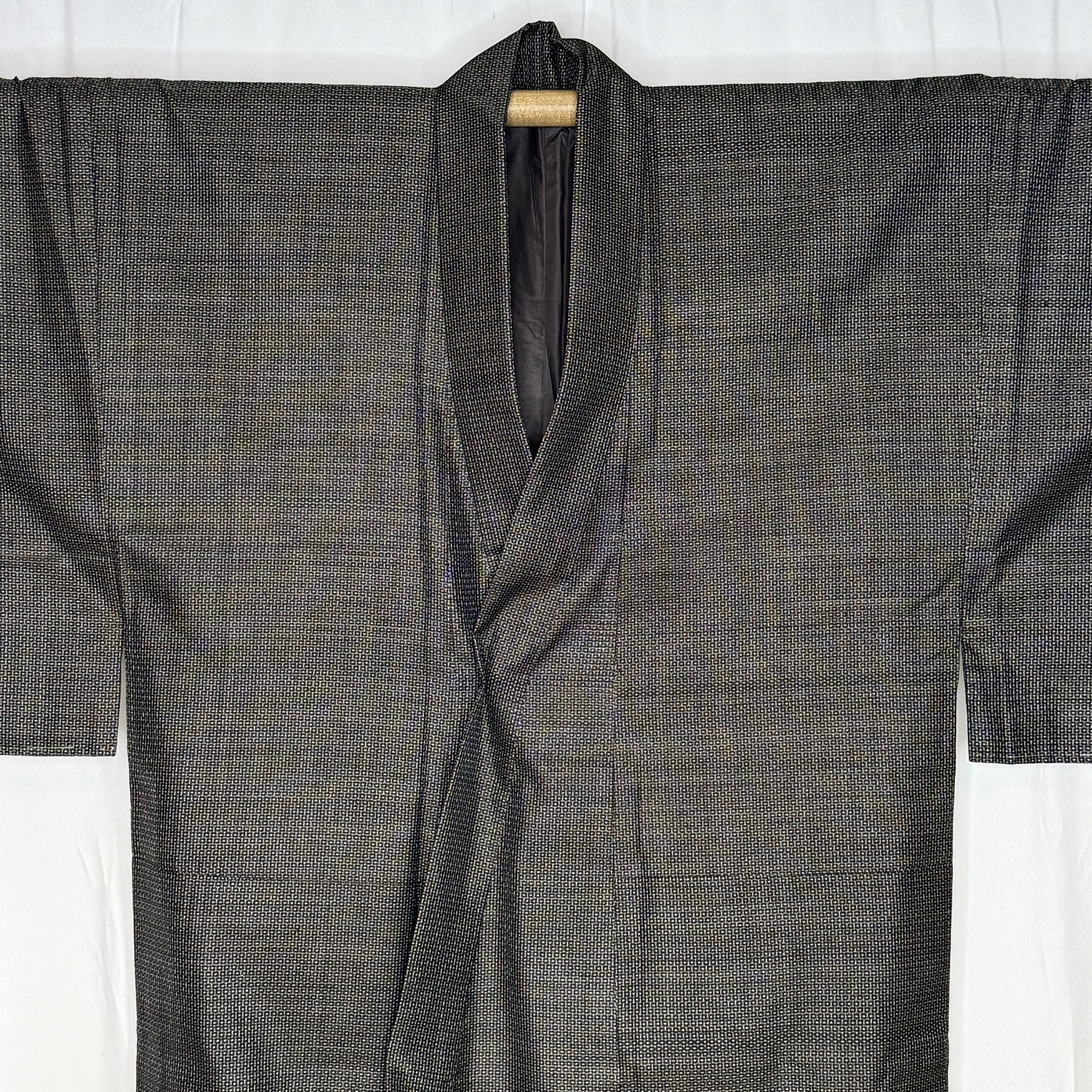 This refined men's kimono balances modern precision with traditional craft through its intricate gray and dark brown woven grid. The fine geometric pattern creates subtle movement, giving the surface a sense of quiet rhythm, like ripples across brushed steel. Lined in soft brown silk, it drapes smoothly with understated elegance.