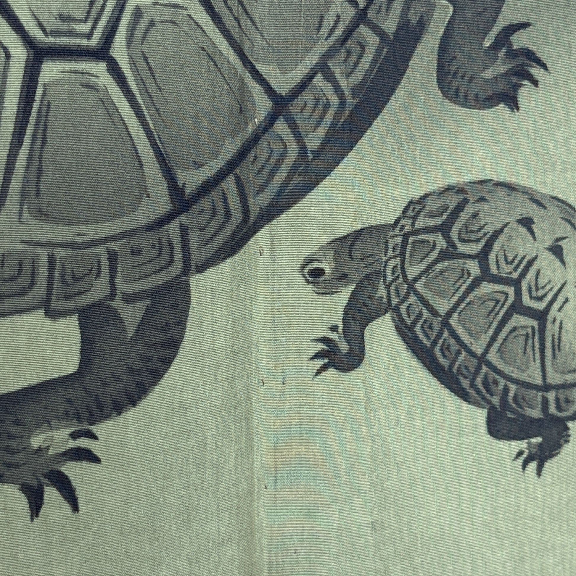 This refined men's haori jacket celebrates endurance and wisdom through a serene ink-style design of two tortoises walking across a soft green landscape. Above them the calligraphy roughly translates to "the clear reflection of one bloom at Kawazu in Ise", a poetic image suggesting purity, longevity, and harmony with nature. The artwork is bordered by a hexgonal kikko (tortoiseshell) pattern reinforcing the theme of everlasting life. Signed by the artist Koko with a circular seal mark.
