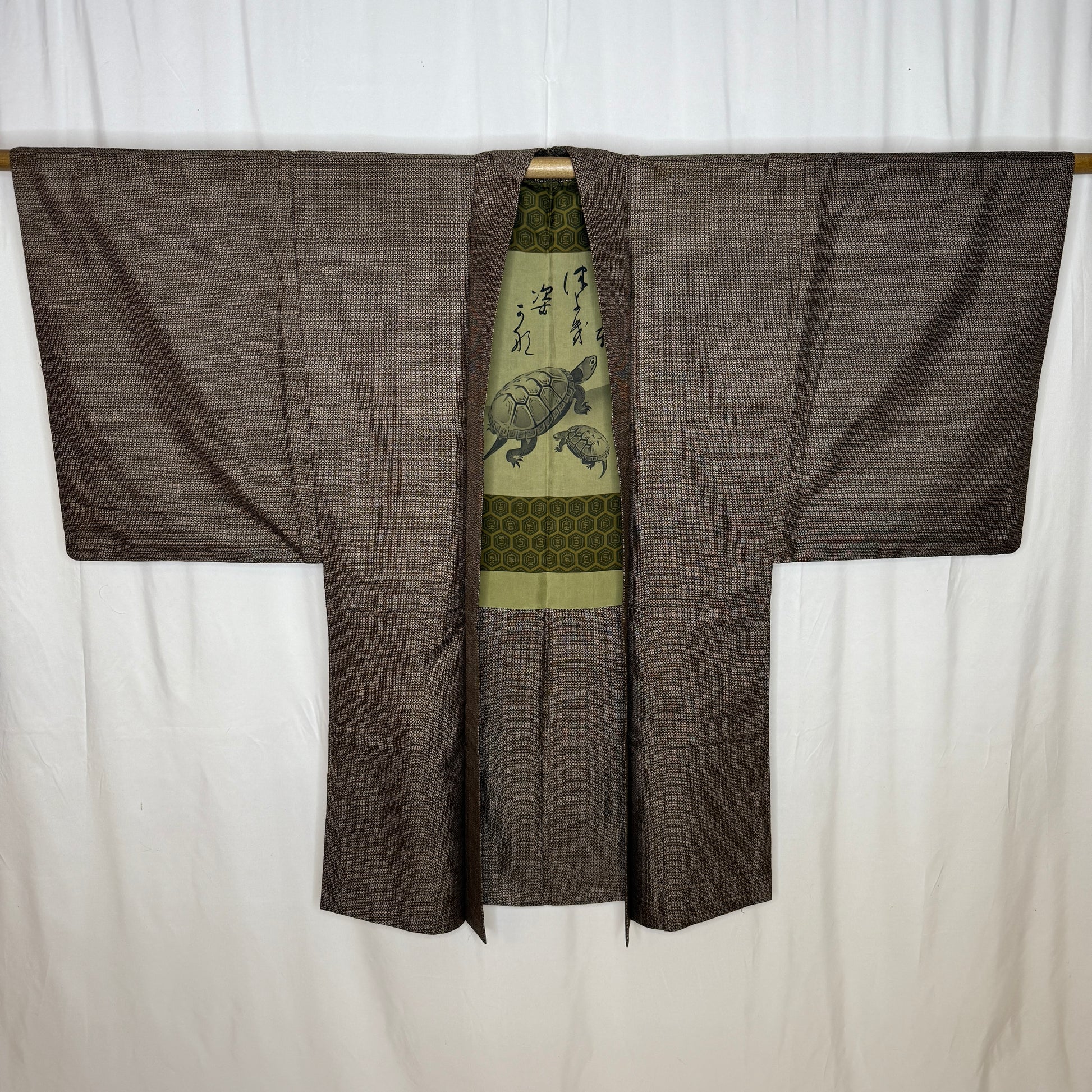 This is a vintage kimono jacket, called a haori, made for a man. The lining of men's haori jackets often depict a scene or motif that was of special interest to the original owner. We often display these jackets inside out to show the lining, and they could be worn this way - inside out - as well; a style that is becoming trendy among Japanese youth. See video below for how haori are worn these days.