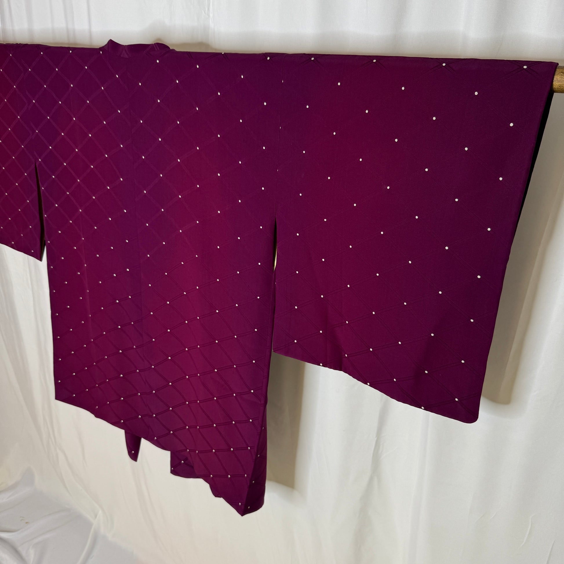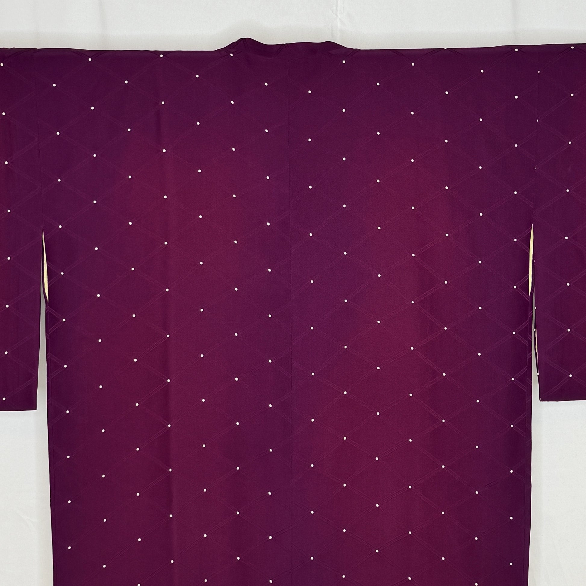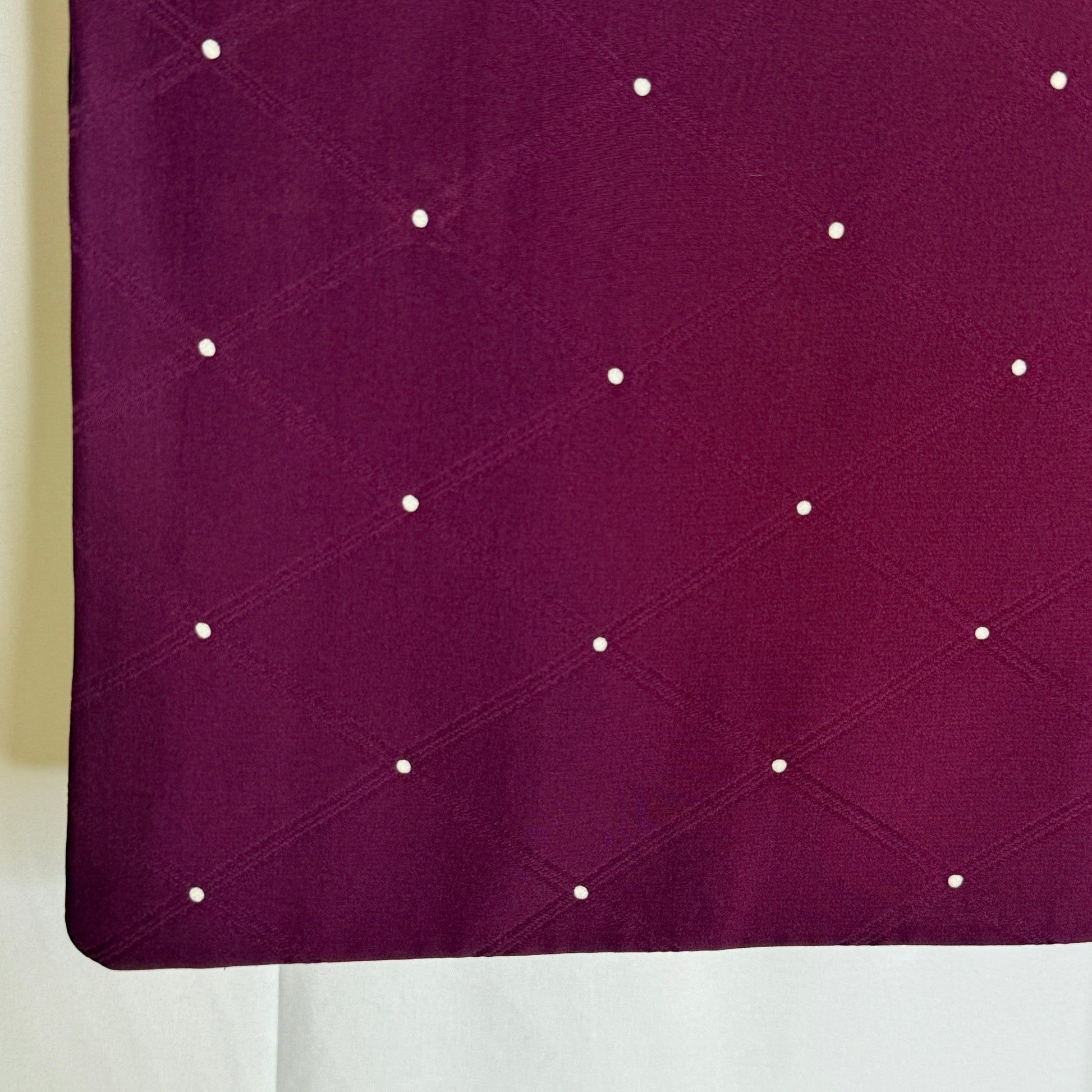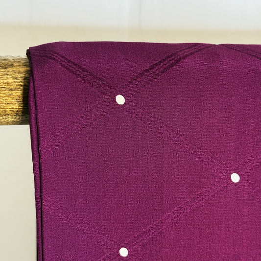 A dark, rich plum color with a smooth drape to the silk. The design is a subtle tone-on tone-jacquard of a diamond grid with small white dots at the intersections. From afar the dots appear like twinkling stars in an evening sky.