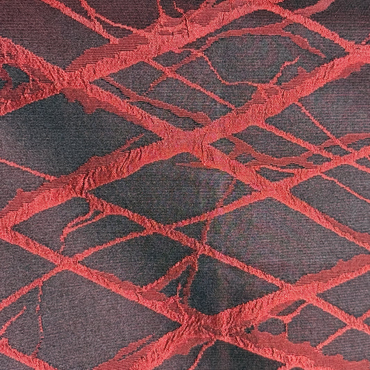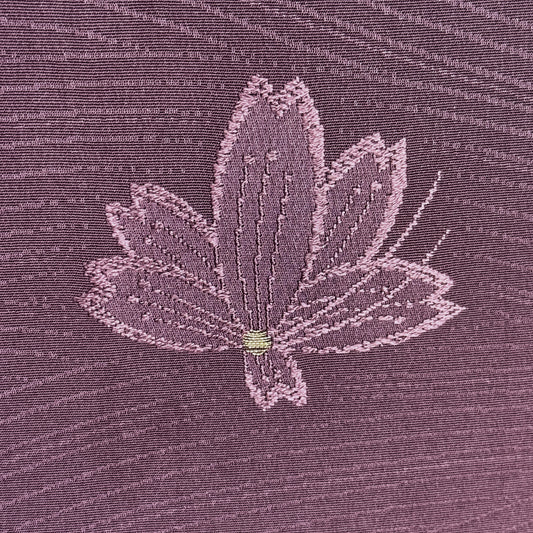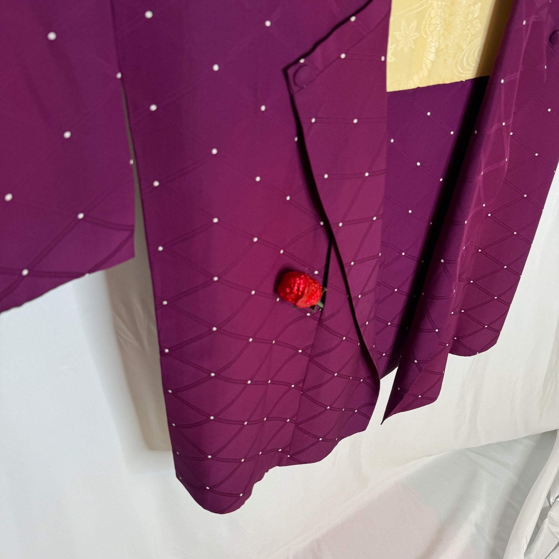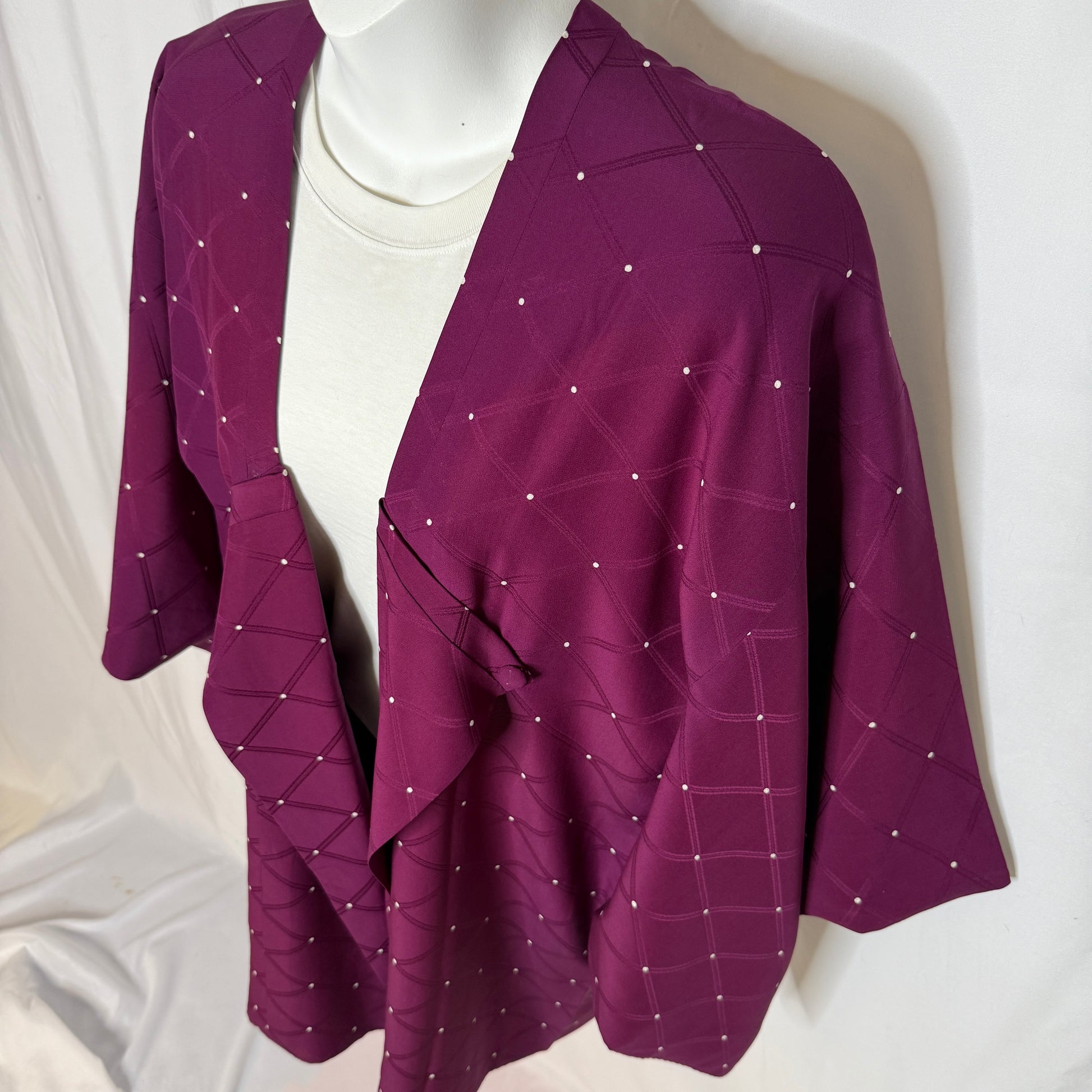 A dark, rich plum color with a smooth drape to the silk. The design is a subtle tone-on tone-jacquard of a diamond grid with small white dots at the intersections. From afar the dots appear like twinkling stars in an evening sky.