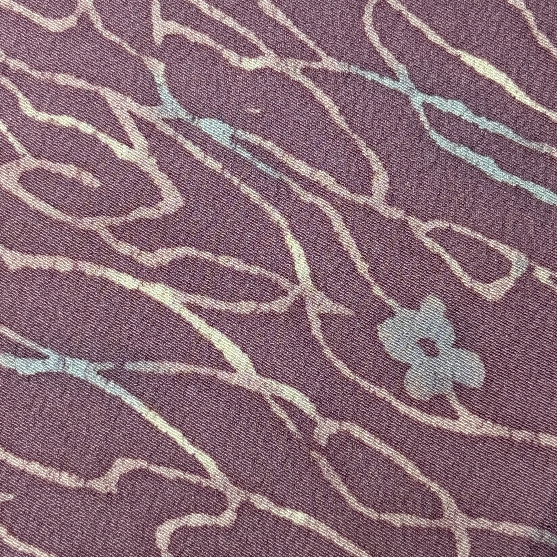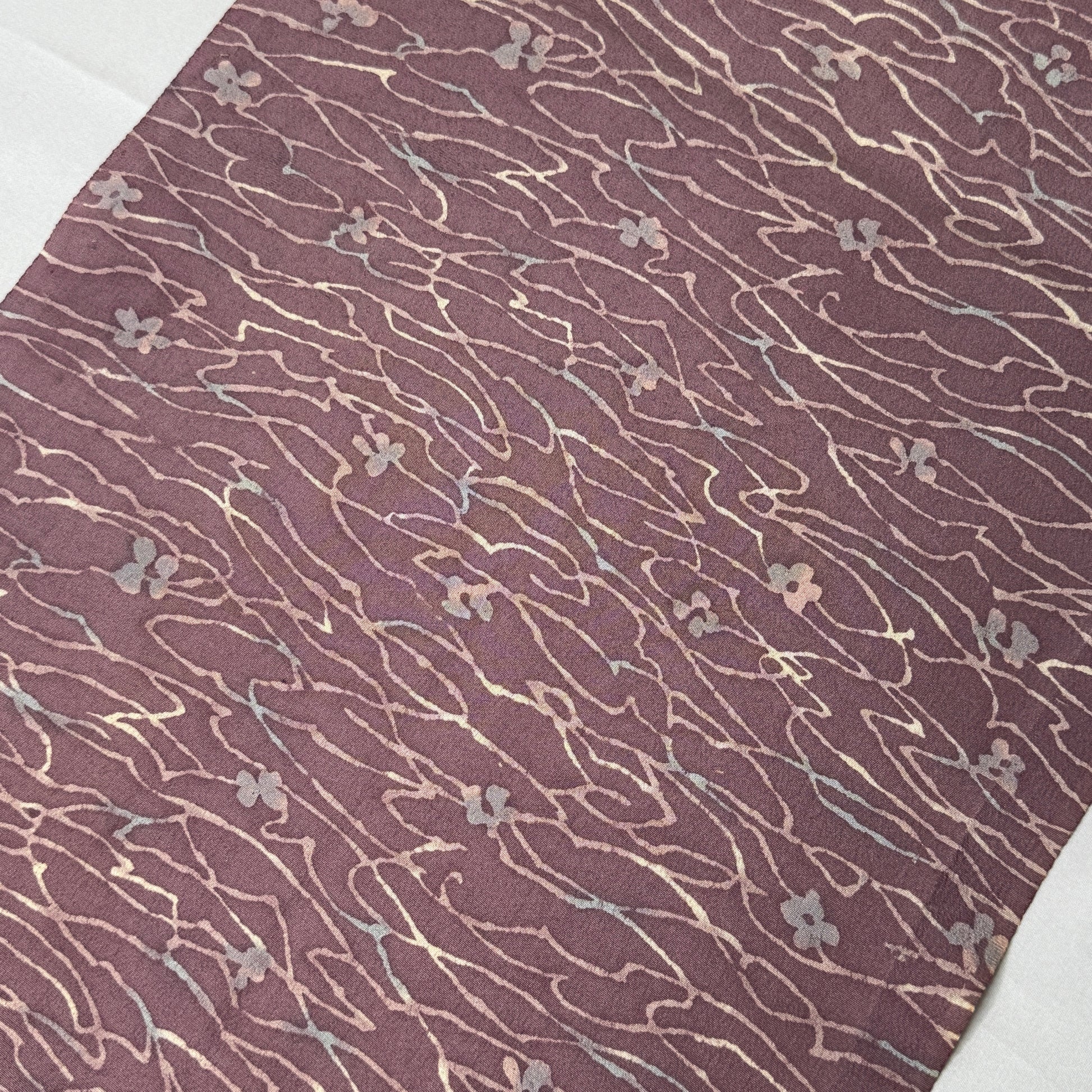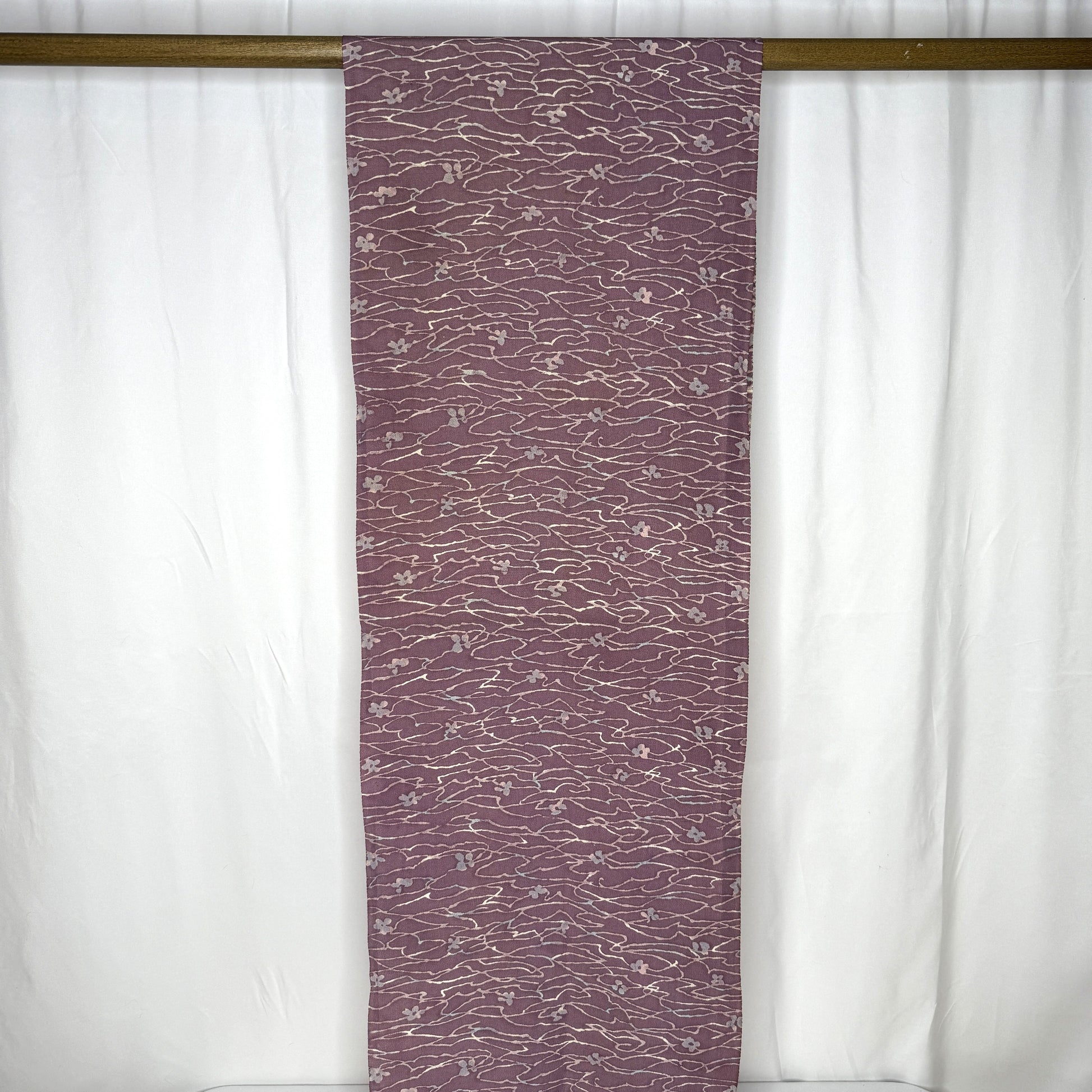 This kimono fabric carries a soft, painterly elegance with wandering abstract lines that ripple across a mauve purple background. Scattered along the lines are tiny blossoms in shades of gray, blue, and pale pink. A graceful design that suggests the petals are floating along a stream as you stroll through a garden on a quiet evening.