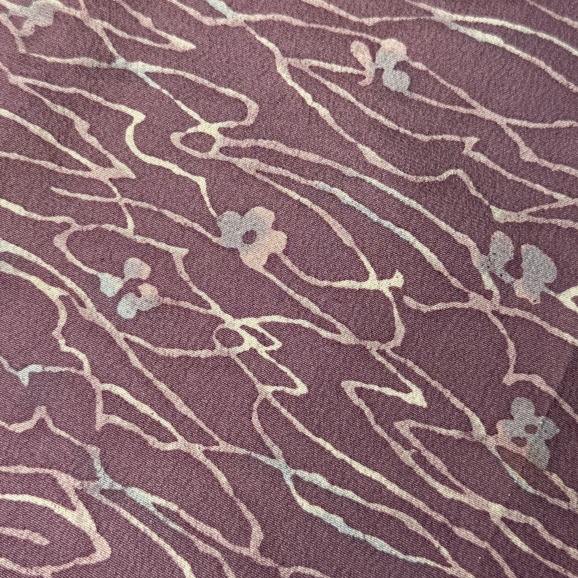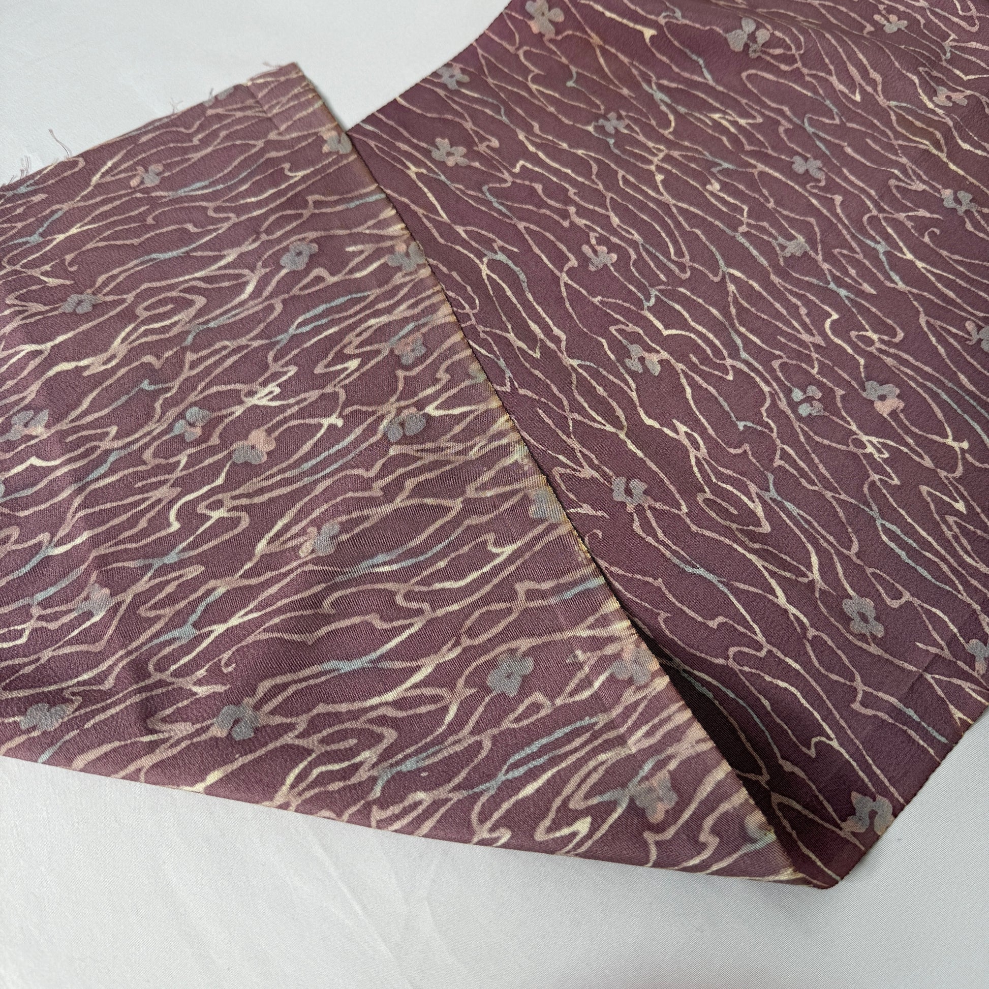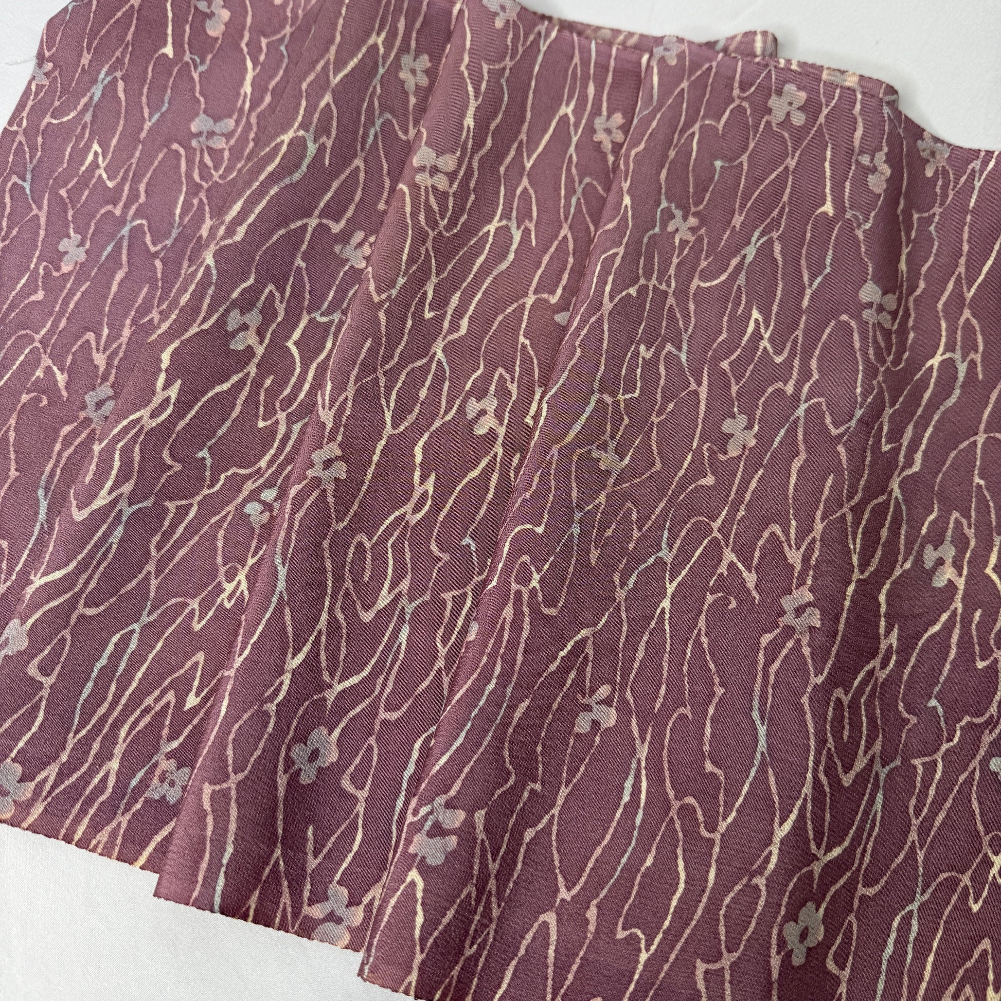 This kimono fabric carries a soft, painterly elegance with wandering abstract lines that ripple across a mauve purple background. Scattered along the lines are tiny blossoms in shades of gray, blue, and pale pink. A graceful design that suggests the petals are floating along a stream as you stroll through a garden on a quiet evening.