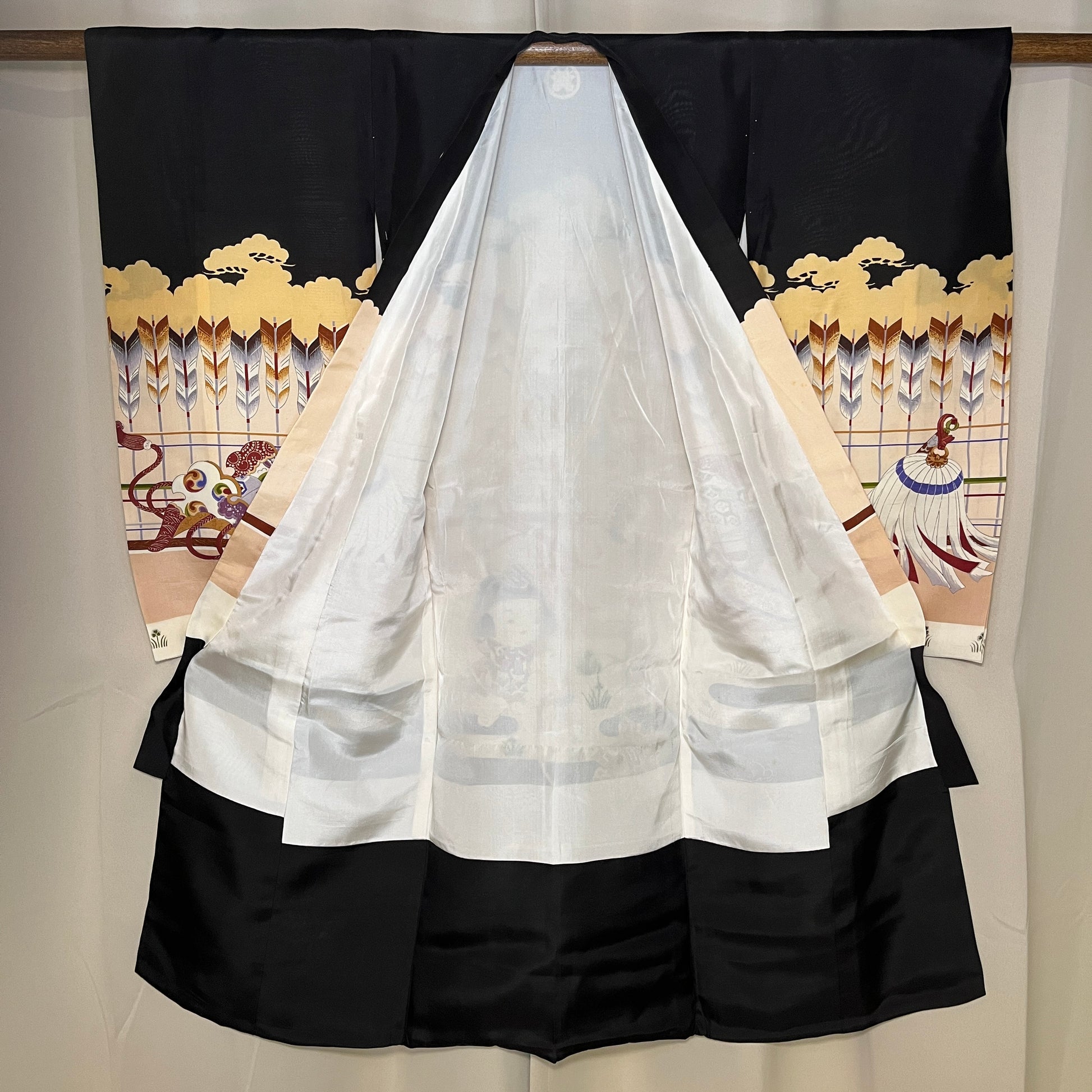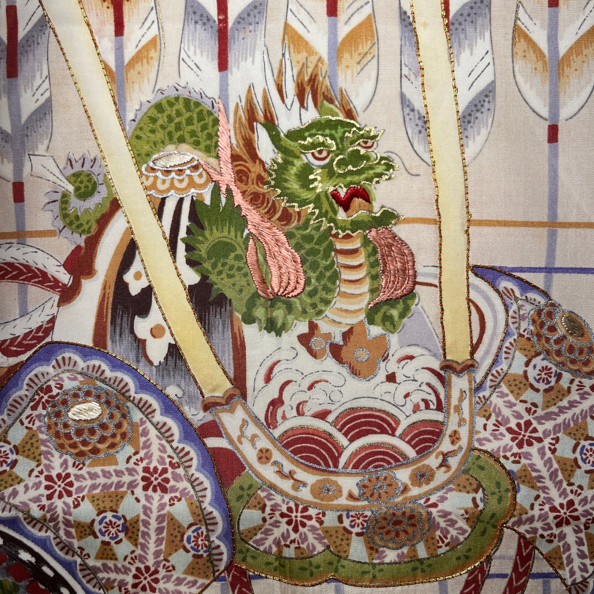 This kimono features an elaborate design, full of interesting motifs. Front and center is the kabuto - a samurai helmet - topped with a fierce green dragon and adorned with panels decorated with traditional Japanese design motifs. Furthering the samurai motif is a decorated saddle on the left sleeve and beautifully decorated stirrup and a matoi banner, used as banners by fire fighters in the Edo Period.