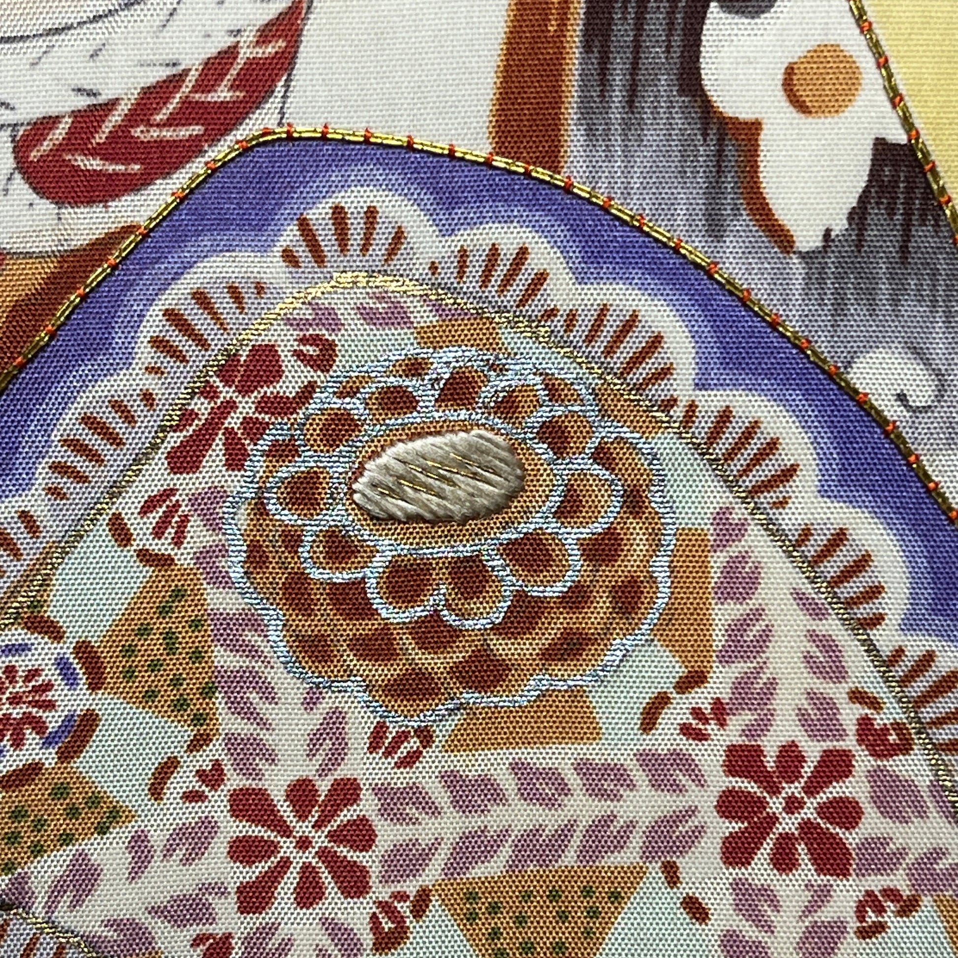 Some elements are embellished with satin stitch embroidery or outlined in gold couching.